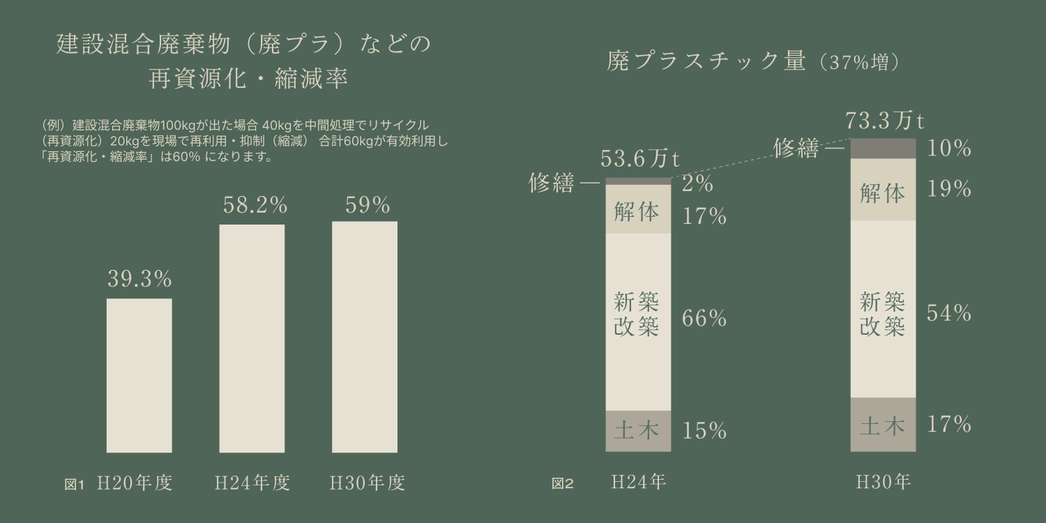 建設混合廃棄物(廃プラ)などの再資源化・縮減率/廃プラスチック量(37%増) 図1:国土交通省 平成30年度建設副産物実態調査結果(暫定値)より一部抜粋  図2:国土交通省 建設副産物実態調査より一部抜粋