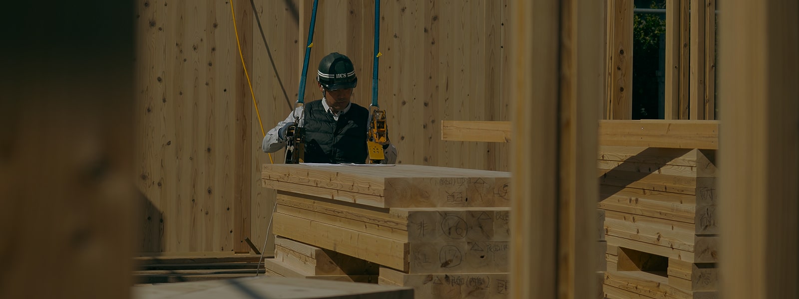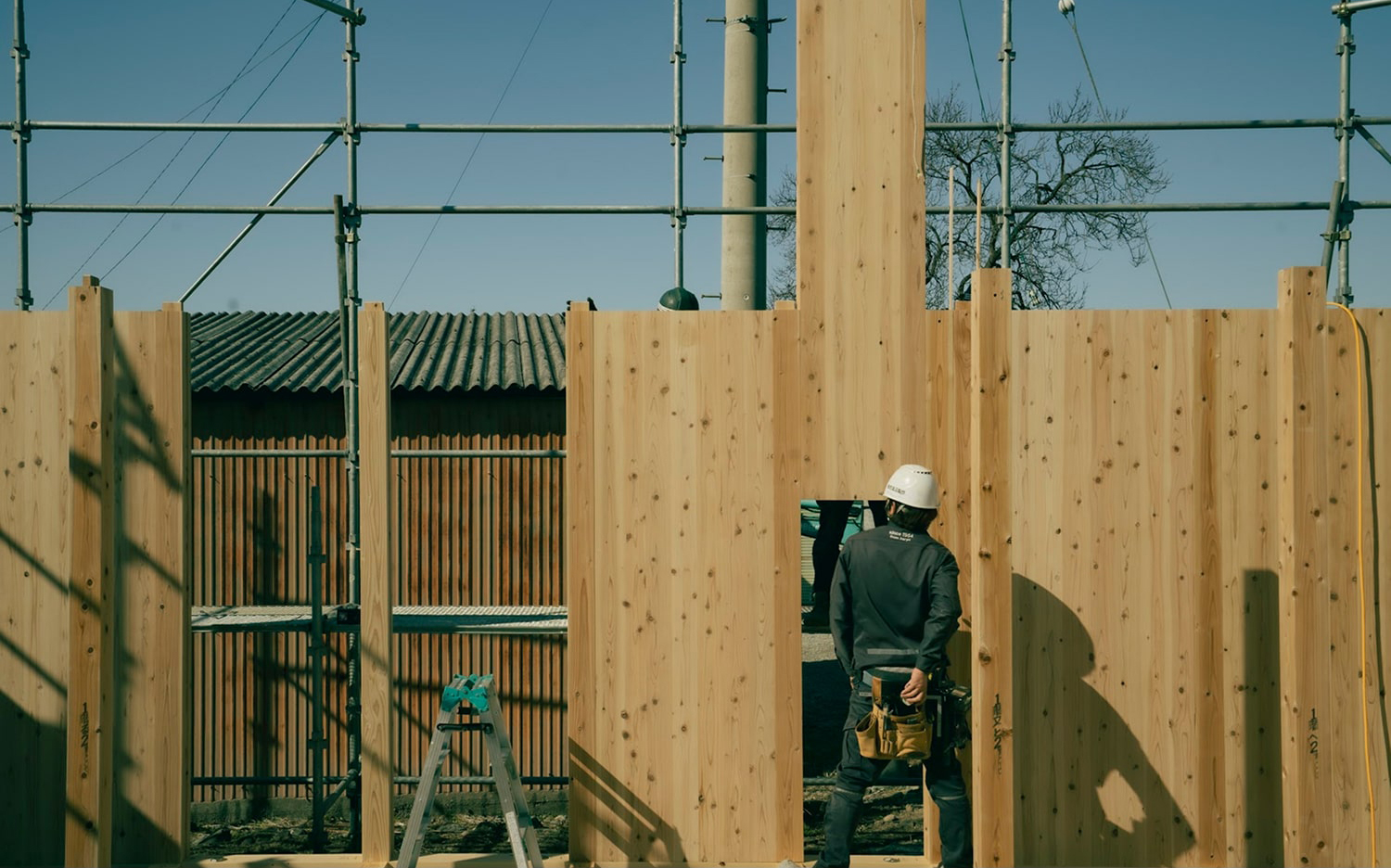 無垢材パネルを縦に組み上げる独自の工法で、高い構造強度と断熱性能を兼ね備えています。壁そのものが断熱層となり、断熱等級7相当の性能も実現可能。木の質感と快適な室内環境を両立する次世代の木造構法です。