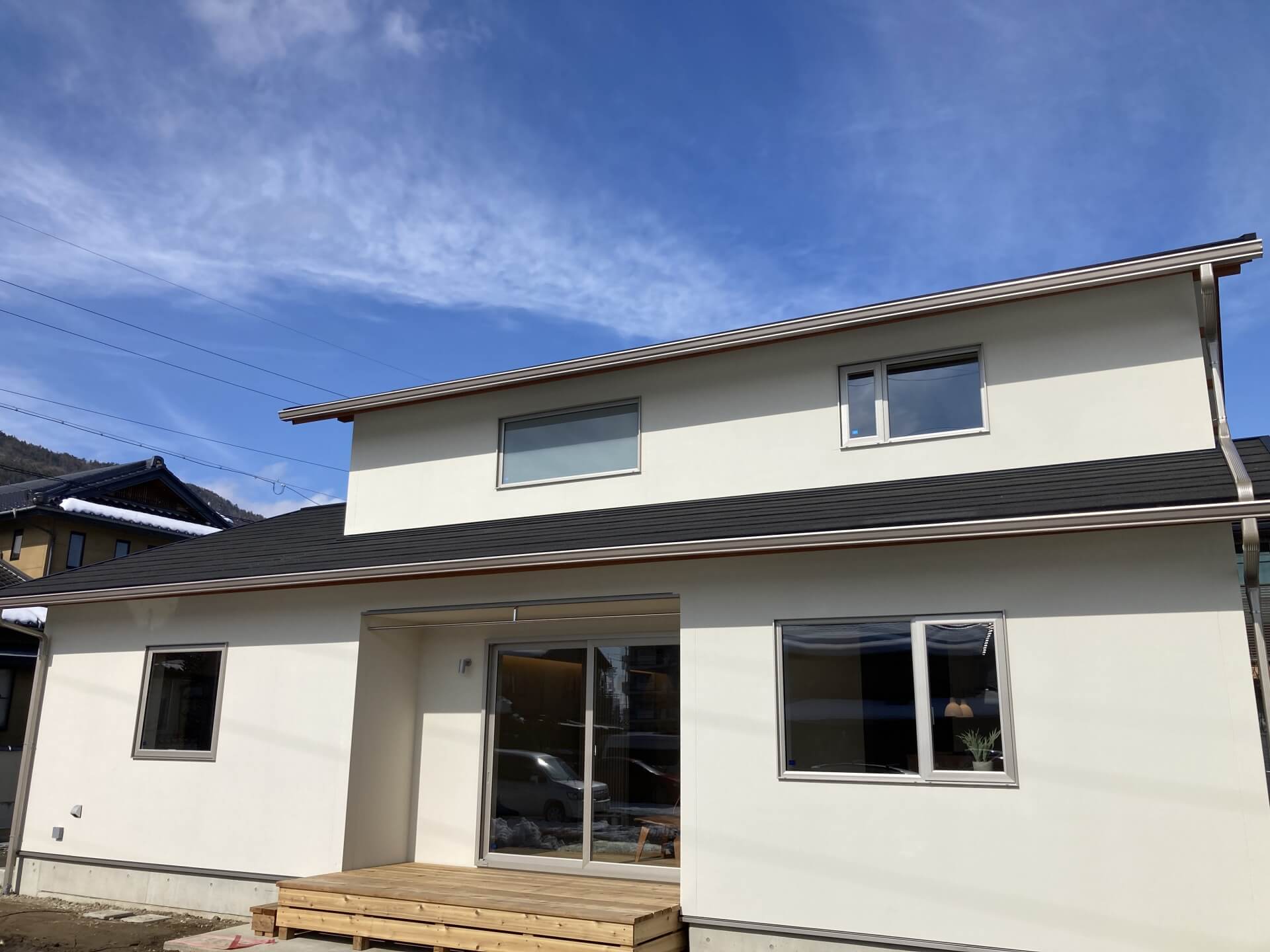 のびのびとした敷地にゆったりとした間取りの家が完成しました。約42坪と大きめの建物ですが、断熱性能を上げ、気密性に配慮して施工することによって、少ないエネルギーで家全体を暖めることができます。今回も付加断熱施工(充填断熱+外張り)、そしてPSパネルヒーターで快適な環境を実現!冷暖房費やヒートショック等の健康被害をを心配することなく、家のどこでもそしていつでも、ちょうどいい温度のもと、のびのび暮らせる・・・ 今回もそんな家が完成しました。
