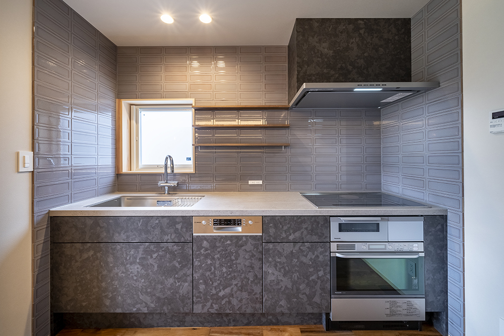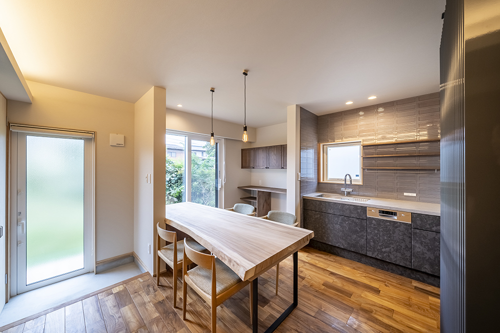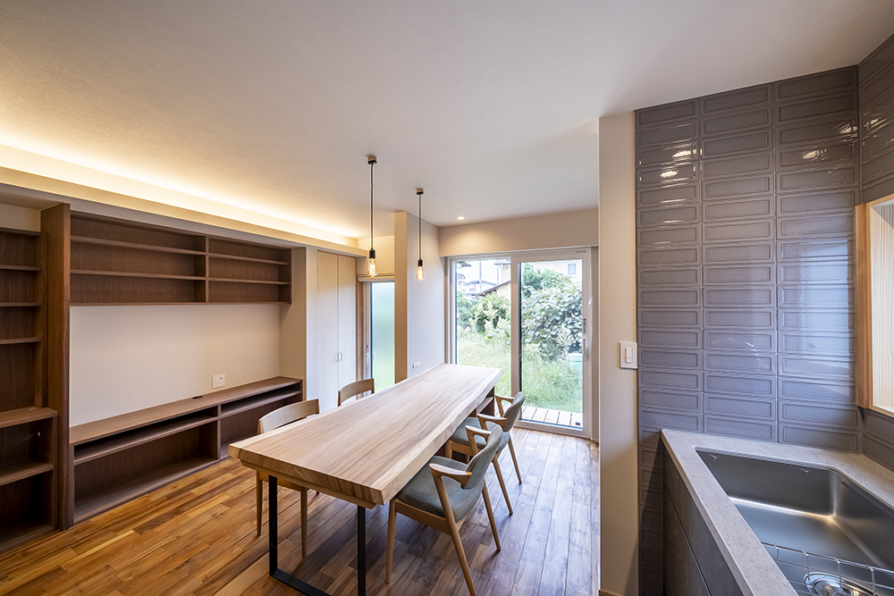 築38年の住宅の1階部分を大々的にリノベーション。断熱・気密性能も上げて快適空間を造るとともに、アトリエ、本棚などご家族の趣味や仕事も活かせるような仕上がりとなりました。タイルが印象的なこだわりのキッチンも存在感があります。