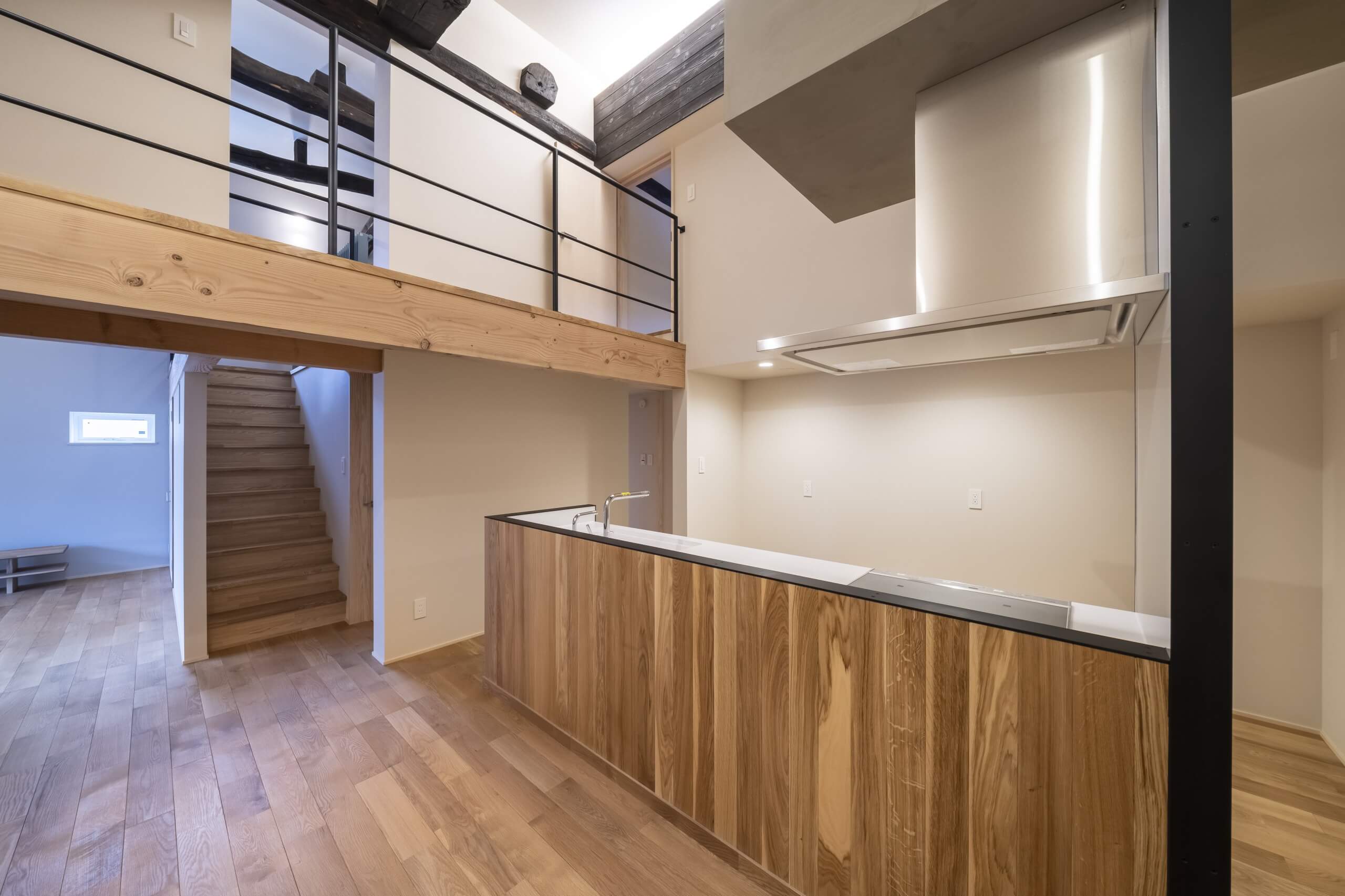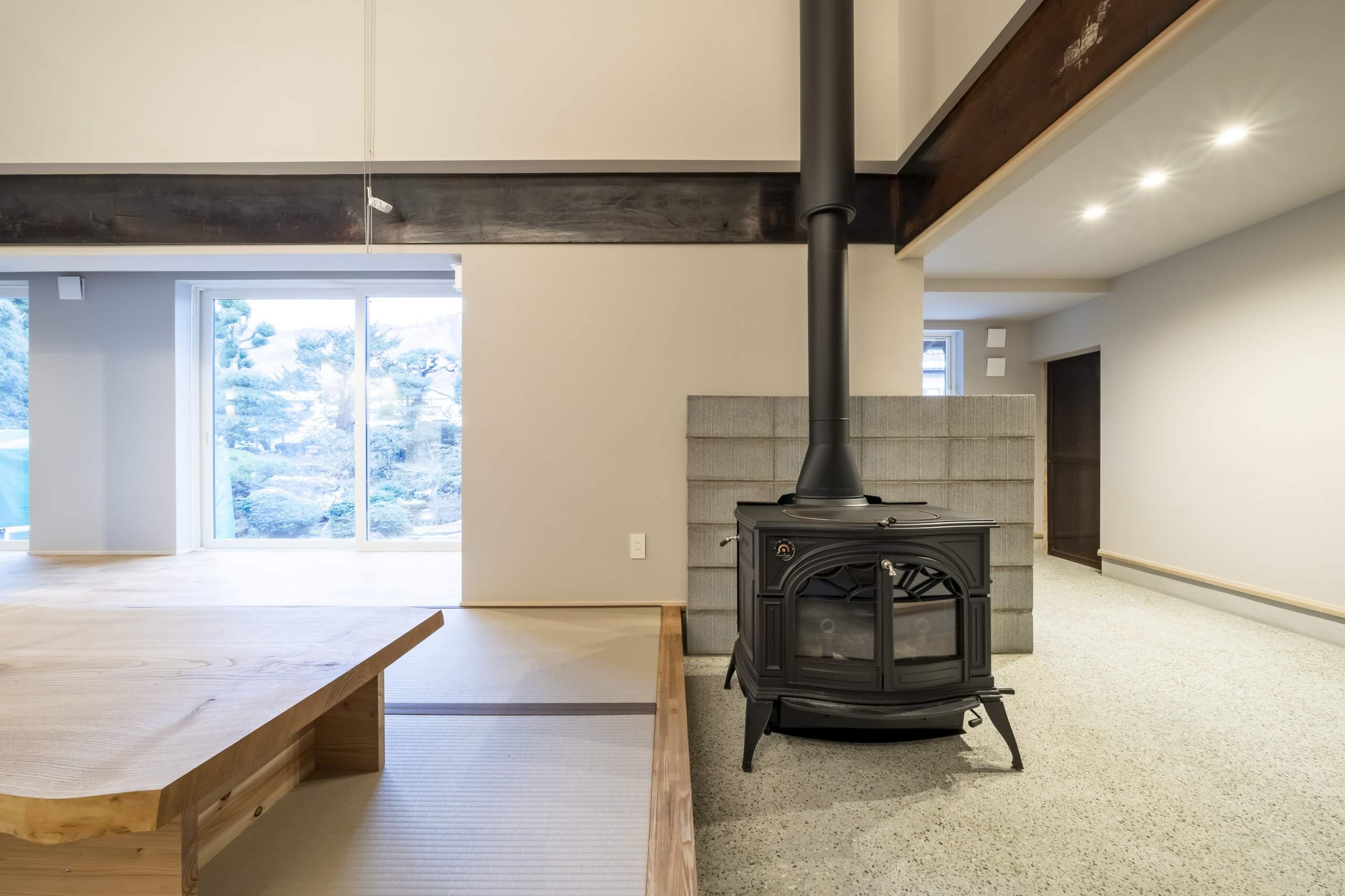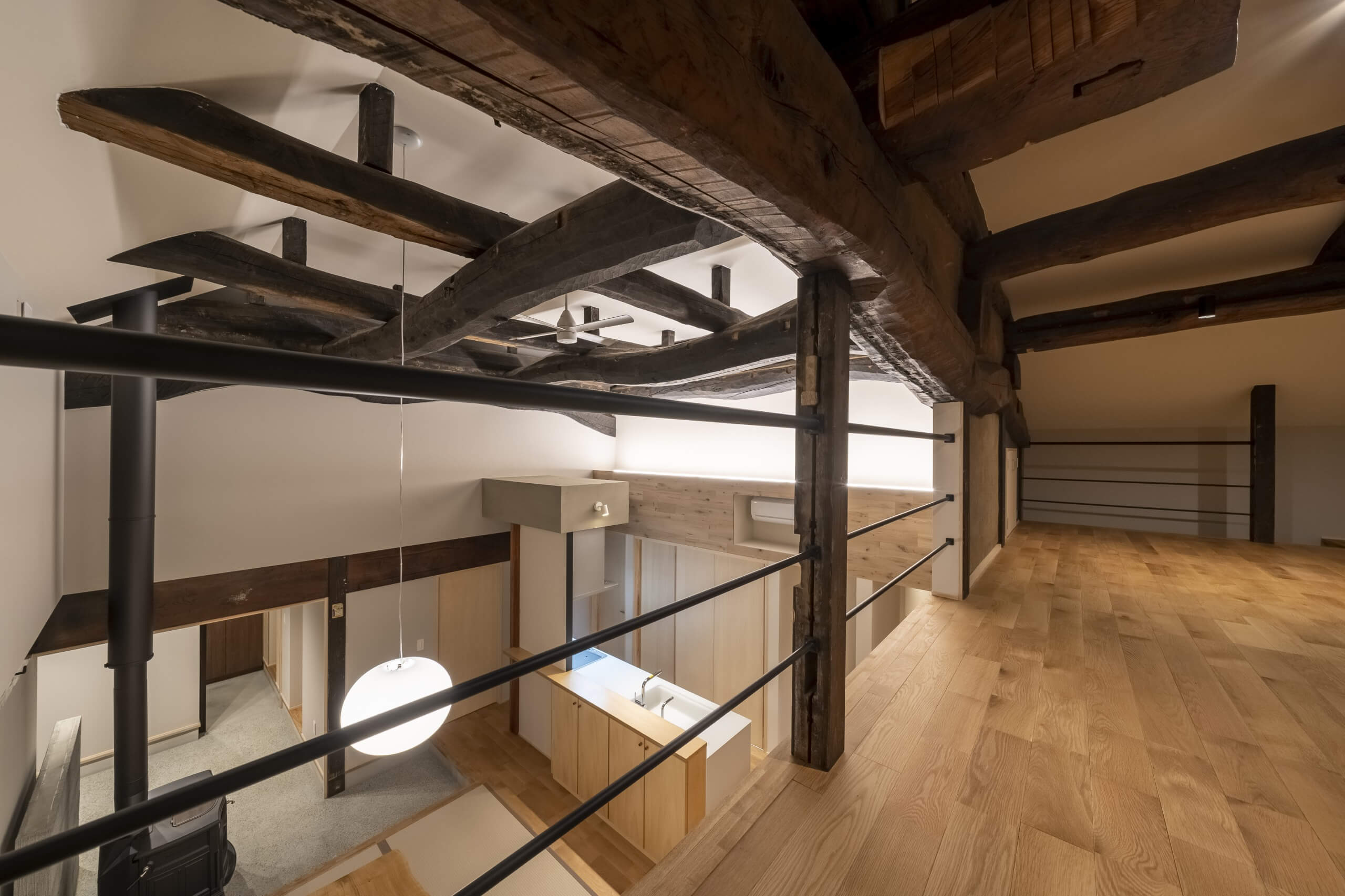 須坂市井上。旧井上村の村役場が置かれていたという場所のほど近く。江戸時代から大切に住み継がれてきた大きな古民家を二世帯住宅としてリノベーション! 薪ストーブがどっしりと置かれた玄関部分は共有。そしてキッチン、お風呂、トイレの水廻りはそれぞれのスペースを確保。建物の味を残し、歴史をつなげ、古きものに感謝をしながら現代のライフスタイルに合わせる・・・