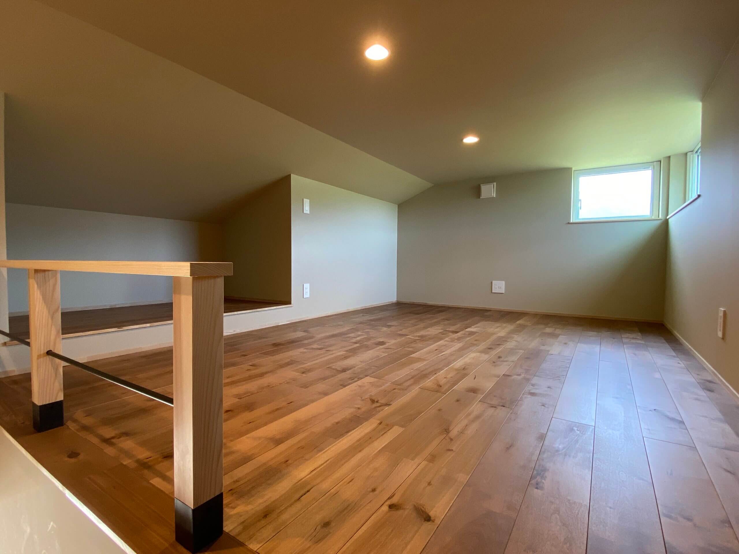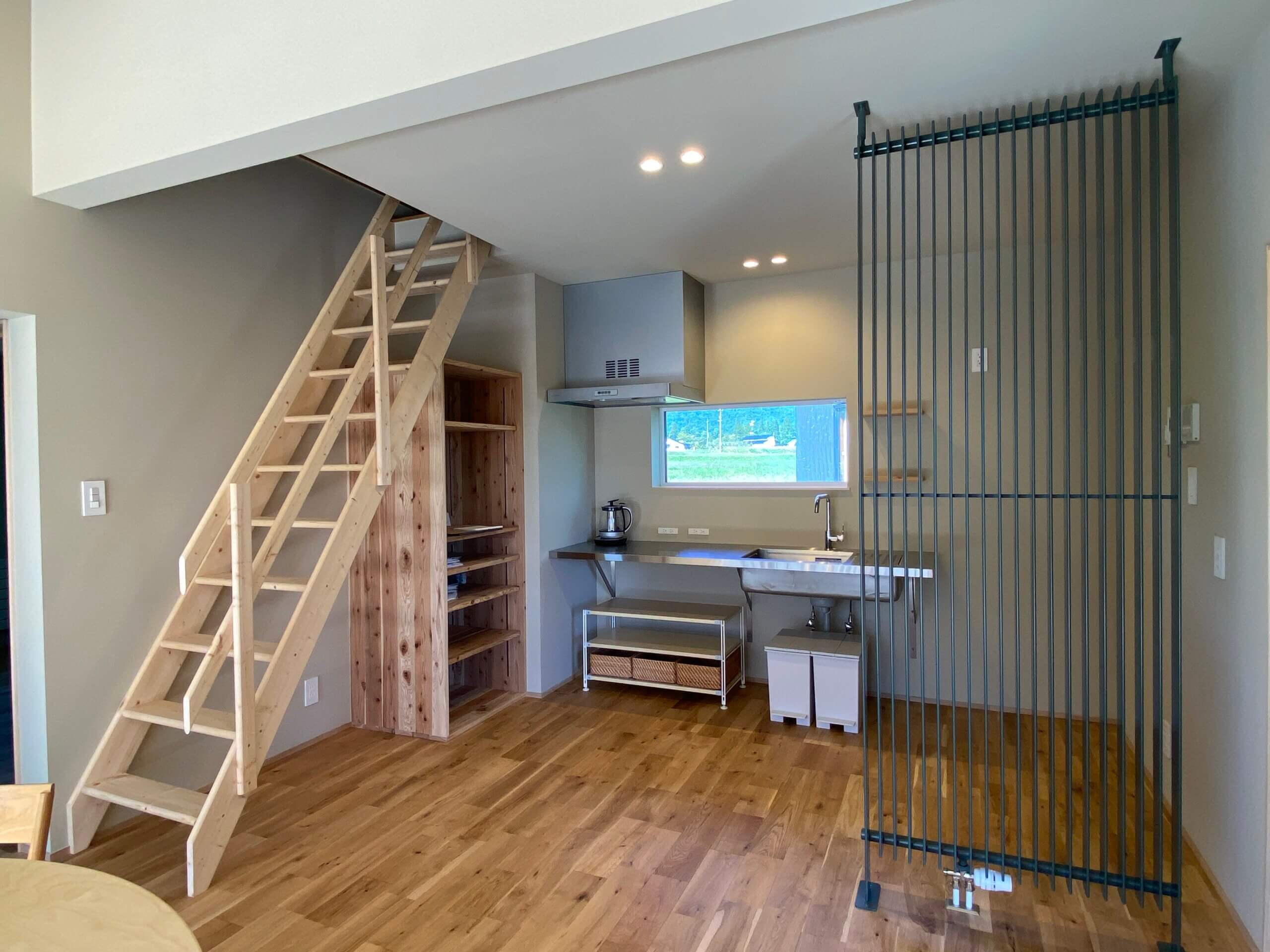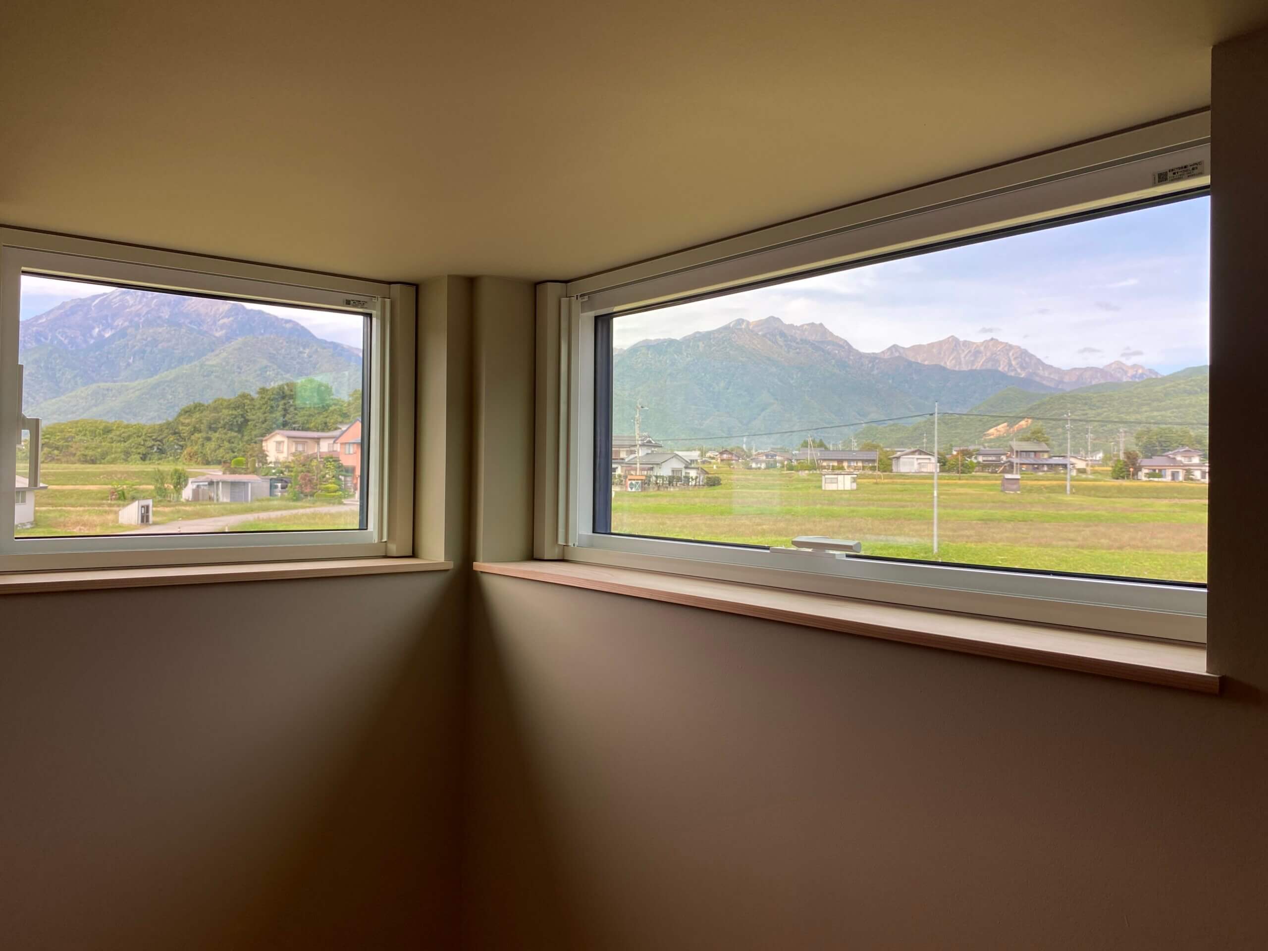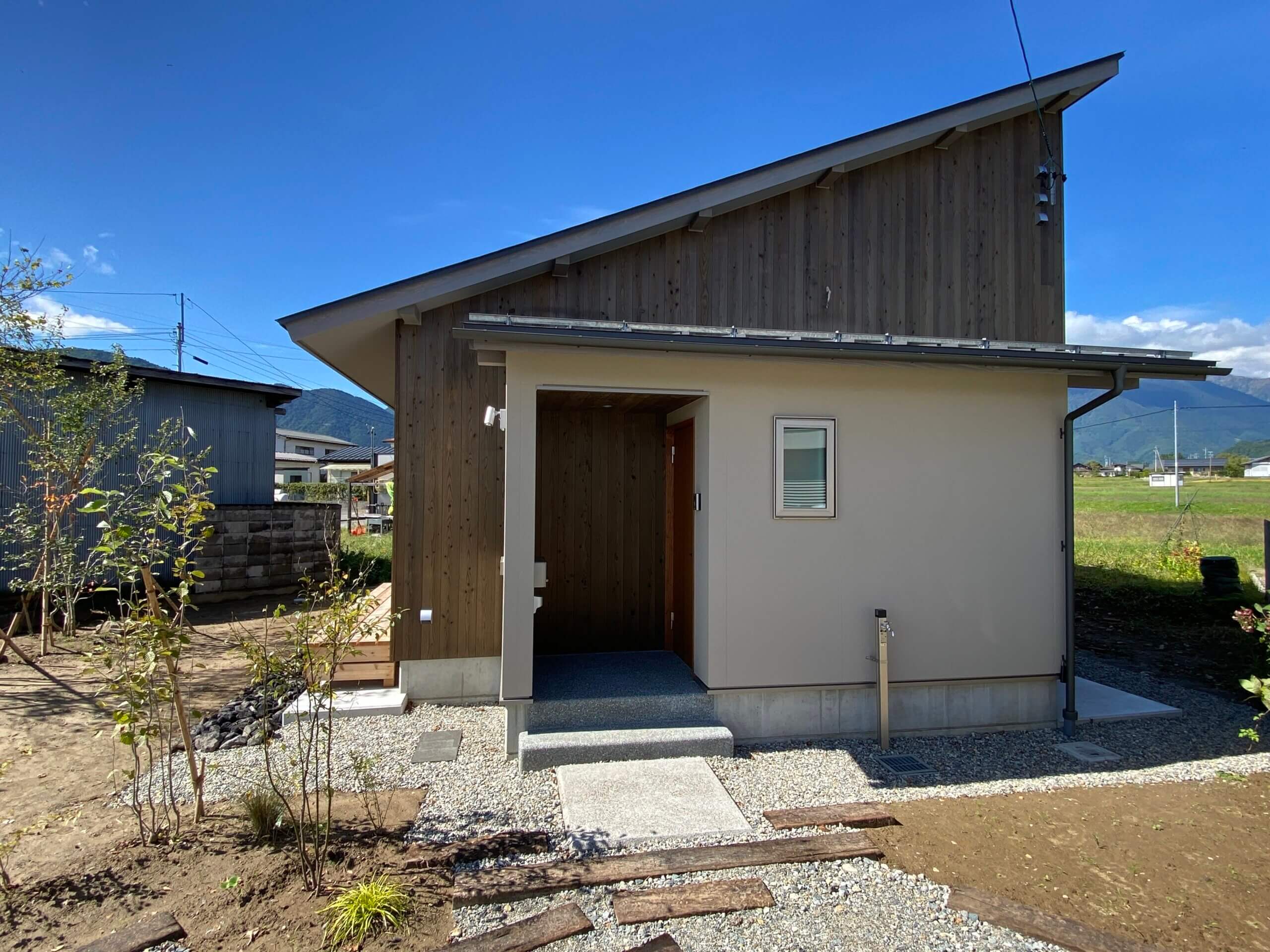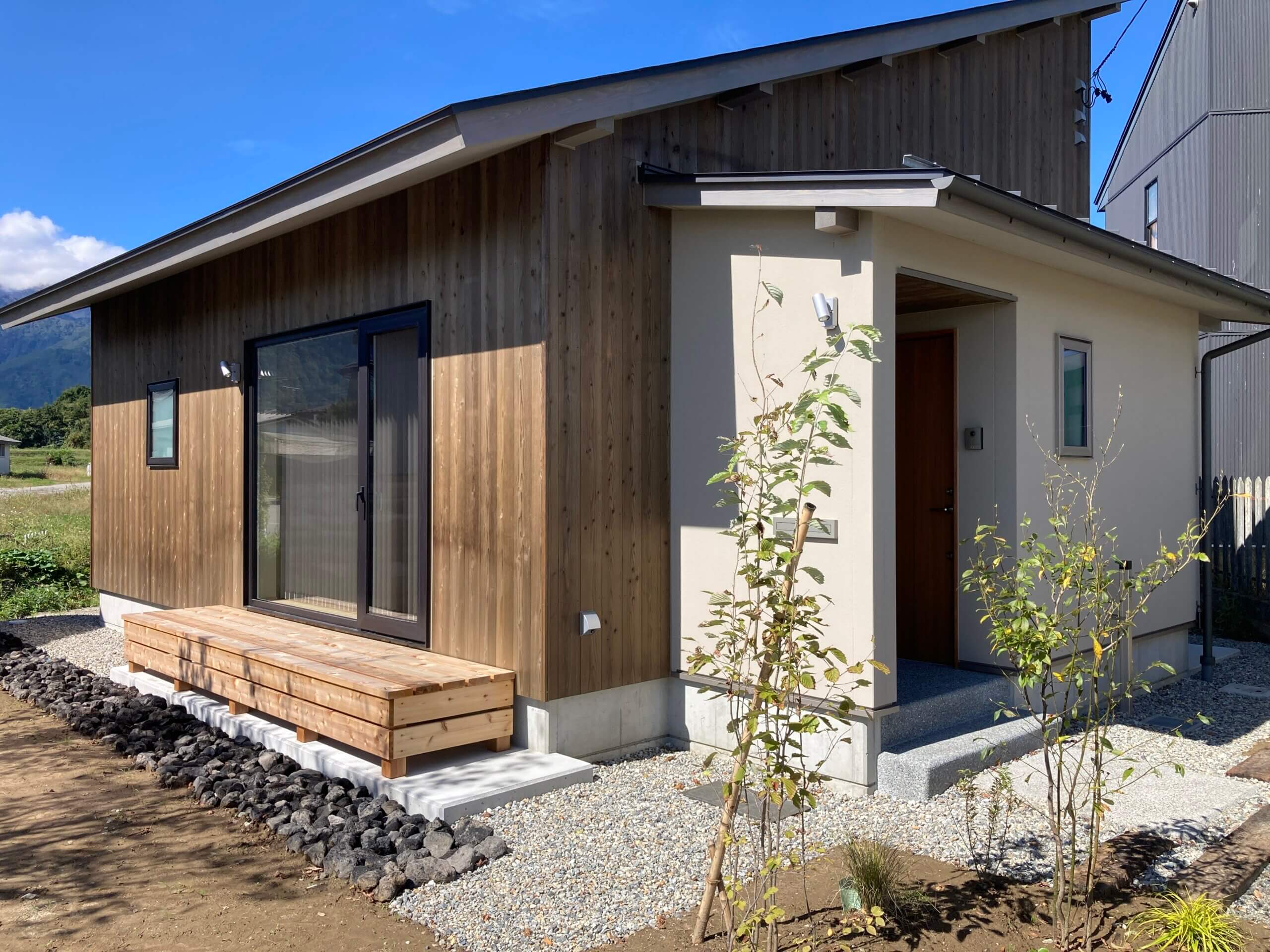 以前から山登りやキャンプなどのアウトドアスポーツが趣味のご夫婦。「いつかは北アルプスが望める場所で暮らしたい」という思いを実現する終の住処が完成しました。シンプルなキッチン、そして山小屋のような雰囲気の板張りの外壁。北側にも窓をとって、家のどこからでも山々の季節の移り変わりを感じとることができます。家の裏にスペースを確保して、春からは念願の畑作りをスタートする予定。