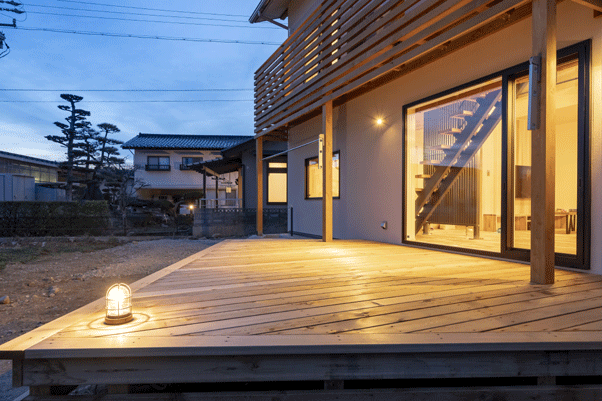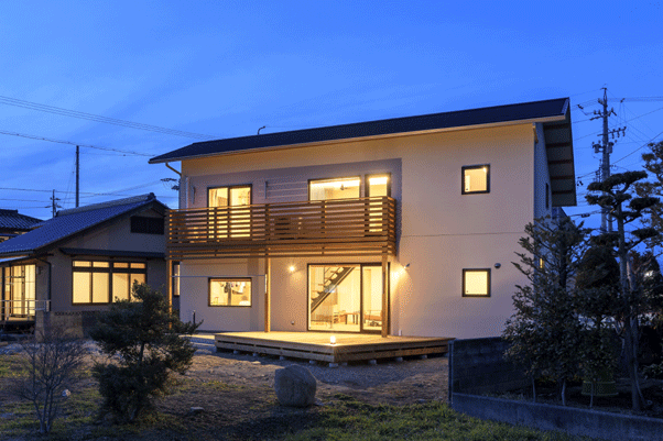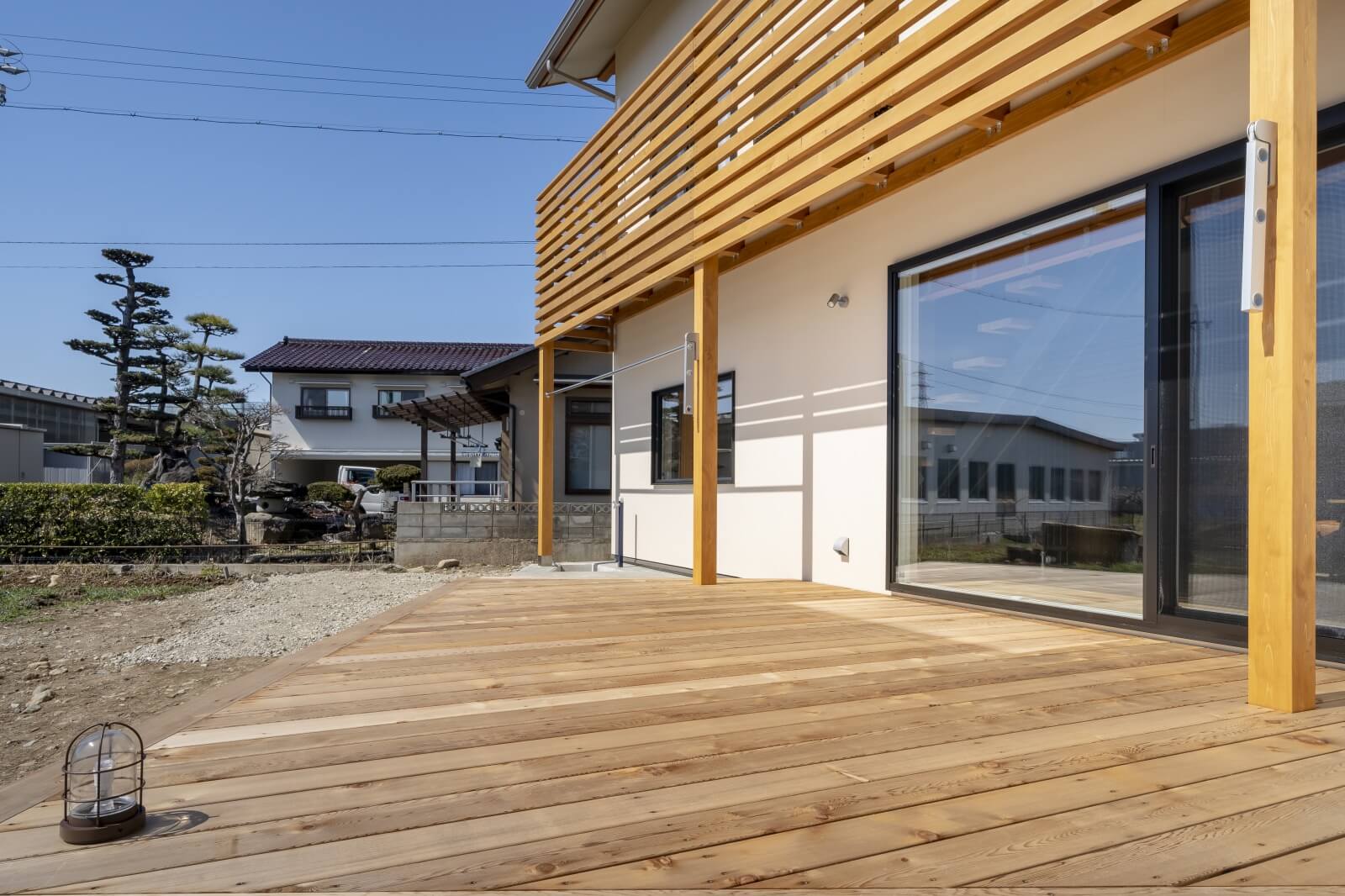 広い敷地を最大限に有効利用し、広々と造ったウッドデッキと庭でのバーベキューや家庭菜園などが楽しめるお家となりました。