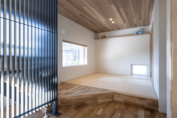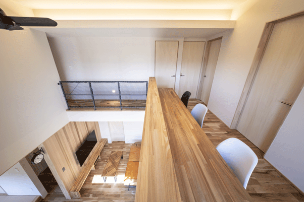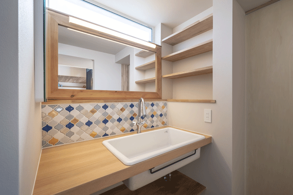 吹き抜け部分に面した読書スペース&ワークペース、和風すぎない畳スペース、タイルがかわいい造作洗面台など、インテリアにもこだわったお洒落な空間になりました。