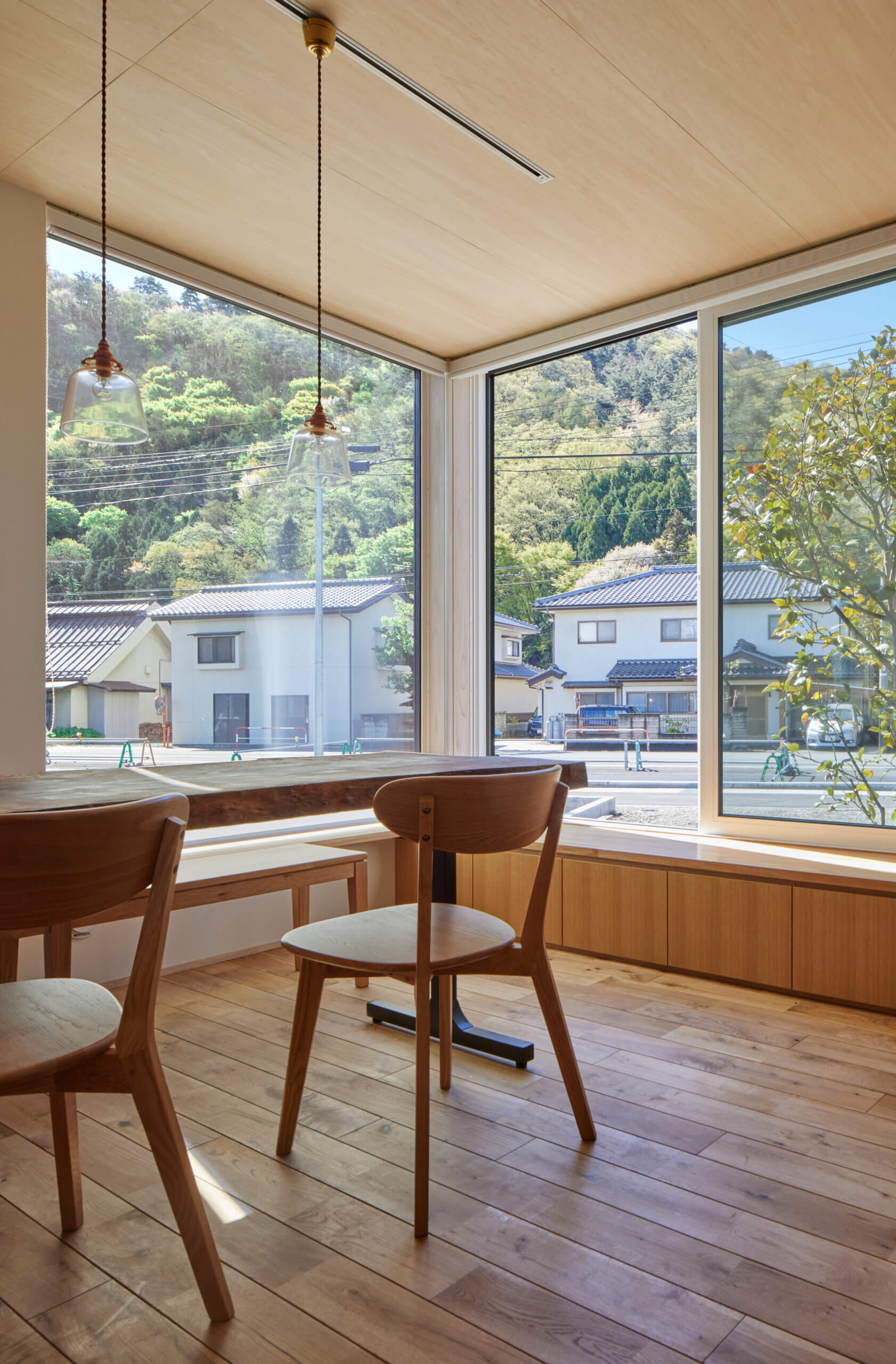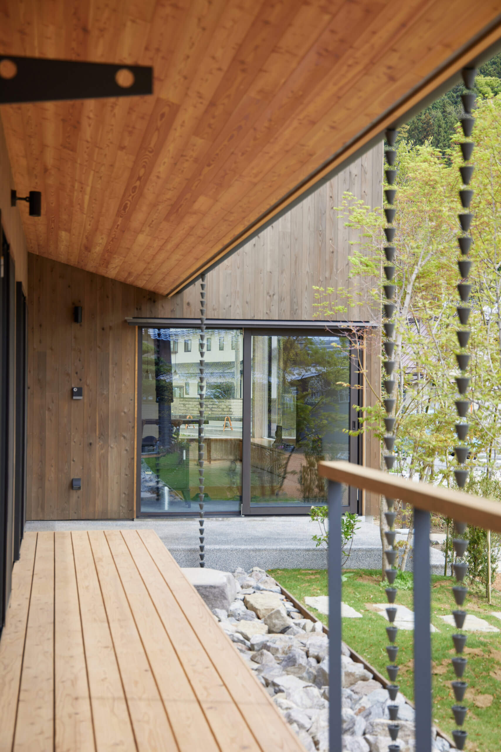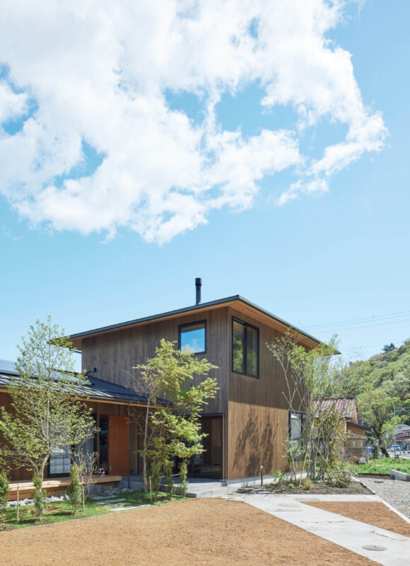 広々とした玄関ホールが共有スペースで、大きな平屋部分が親世帯、煙突の見える二階建て部分が子世帯のゆとりのある間取りの二世帯住宅。松代町岩野の国道403号線沿い、「ウッドロングエコ」を塗布した全面杉板張りの外観が目を引きます。家の中も外も、無垢の木のぬくもりに満たされています。