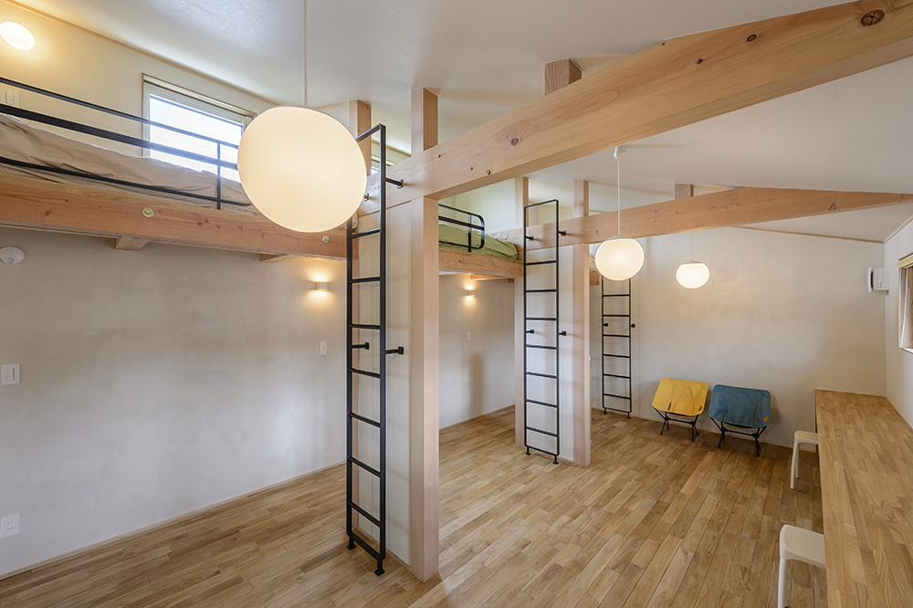 5人家族がたのしく快適に暮らせる設計。回遊出来るLDKスペース、ロフトスペースを活用した子供部屋、家の中央に配されたキッチンなどなど、とてもオシャレに仕上がっています。*「高断熱・高気密」 + 「PS社のパネルヒーター」で、夏も冬も快適です!!