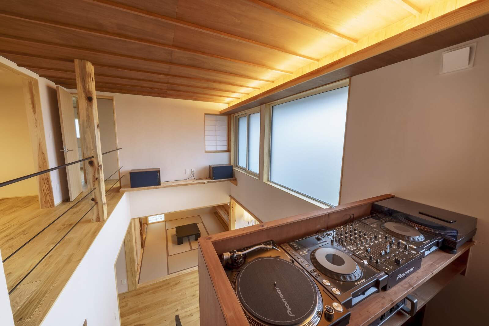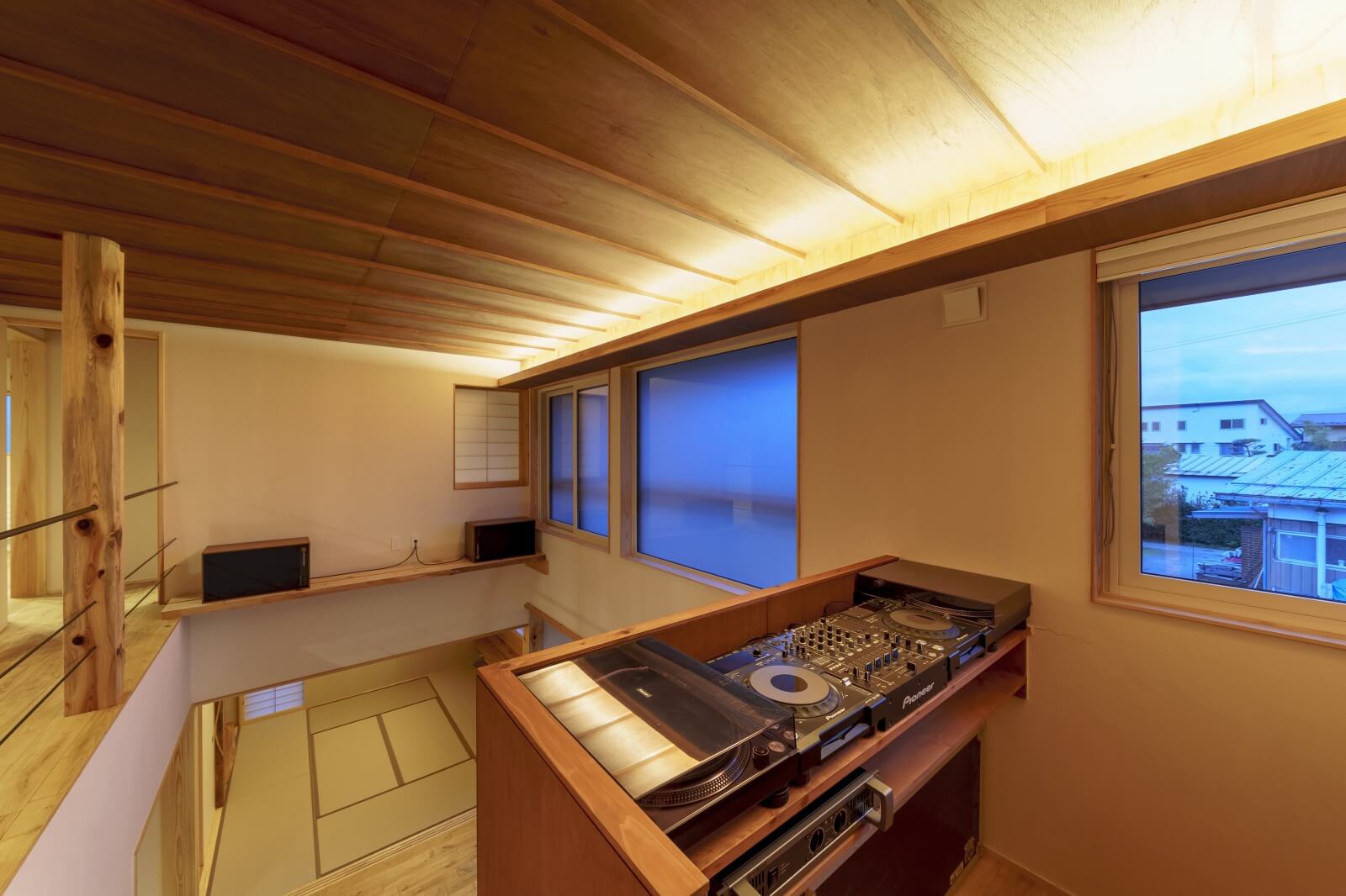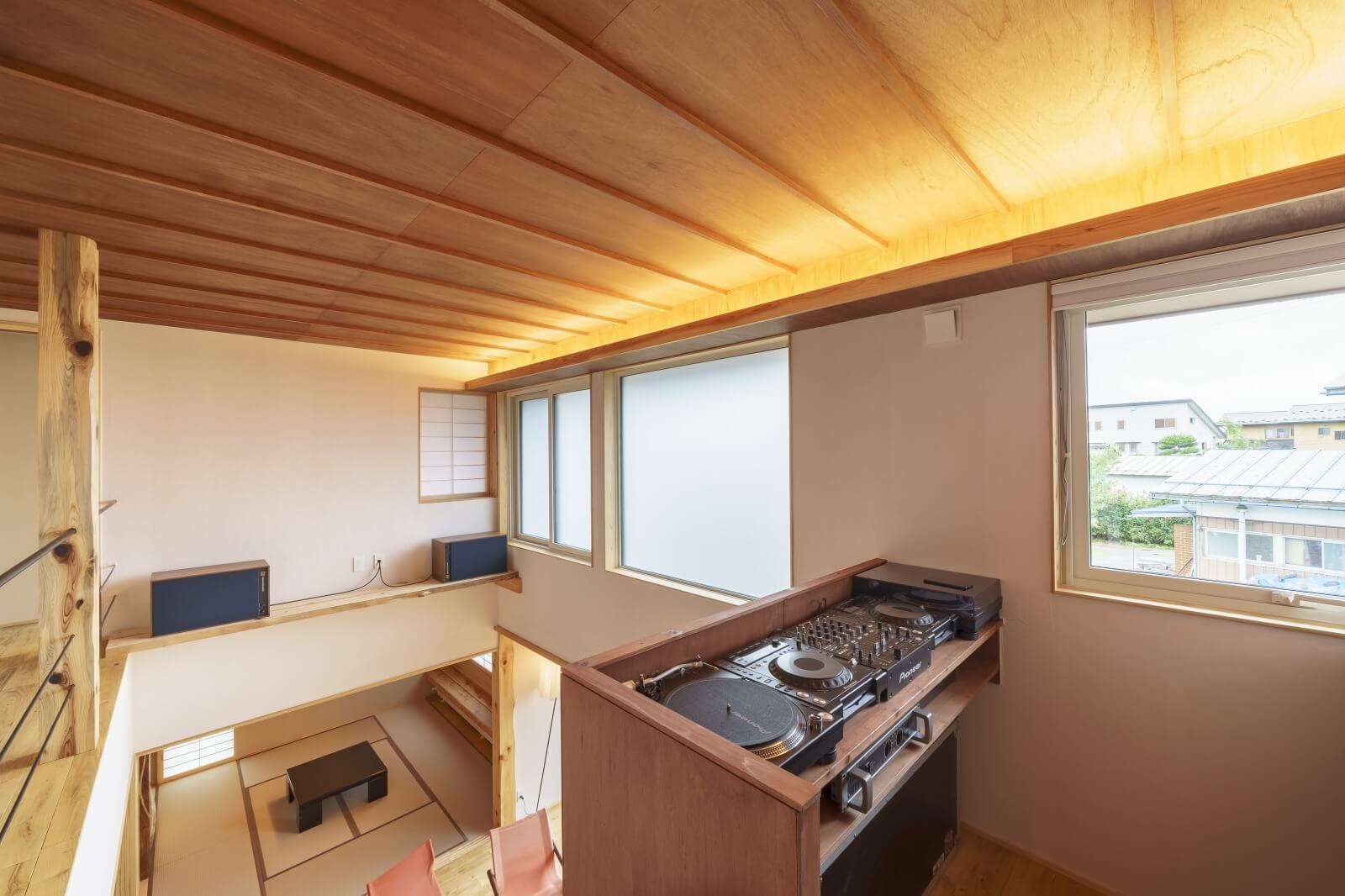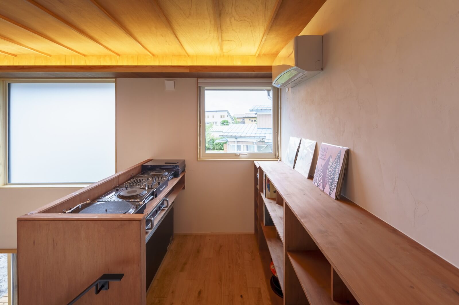 ご実家にストックしてあった木を沢山使ったバラック(いい意味で)のような家。ファサードは広い敷地にぽつんと建つ小屋のような可愛らしい外観とし、それに負けないくらいに室内も木が溢れる空間に仕上がりました。また、中二階に設けたDJブース、一見不釣り合いだけれども、使い勝手がいい和室のベンチなど、さまざまな工夫が施された住まいです。