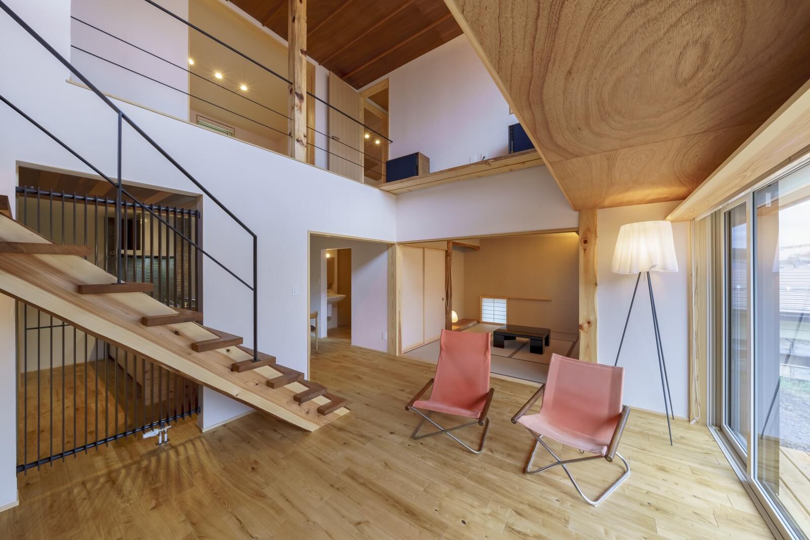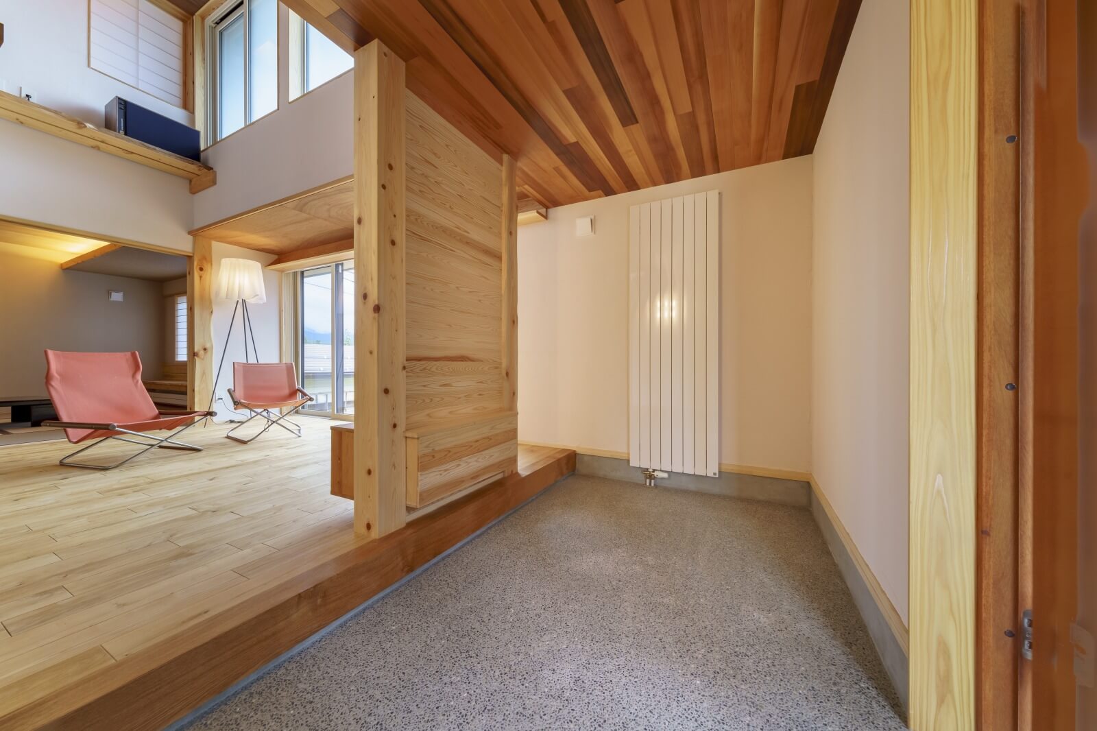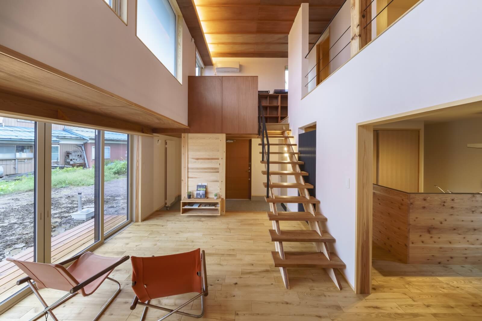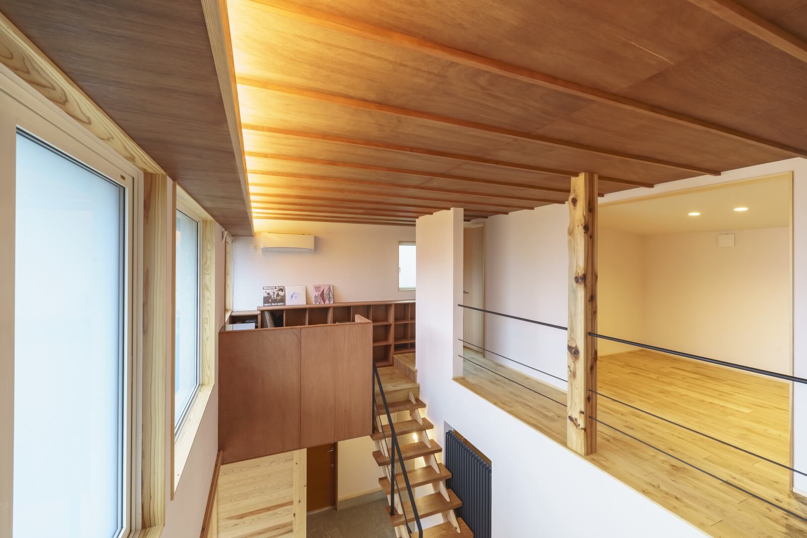 ご実家にストックしてあった木を沢山使ったバラック(いい意味で)のような家。ファサードは広い敷地にぽつんと建つ小屋のような可愛らしい外観とし、それに負けないくらいに室内も木が溢れる空間に仕上がりました。また、中二階に設けたDJブース、一見不釣り合いだけれども、使い勝手がいい和室のベンチなど、さまざまな工夫が施された住まいです。
