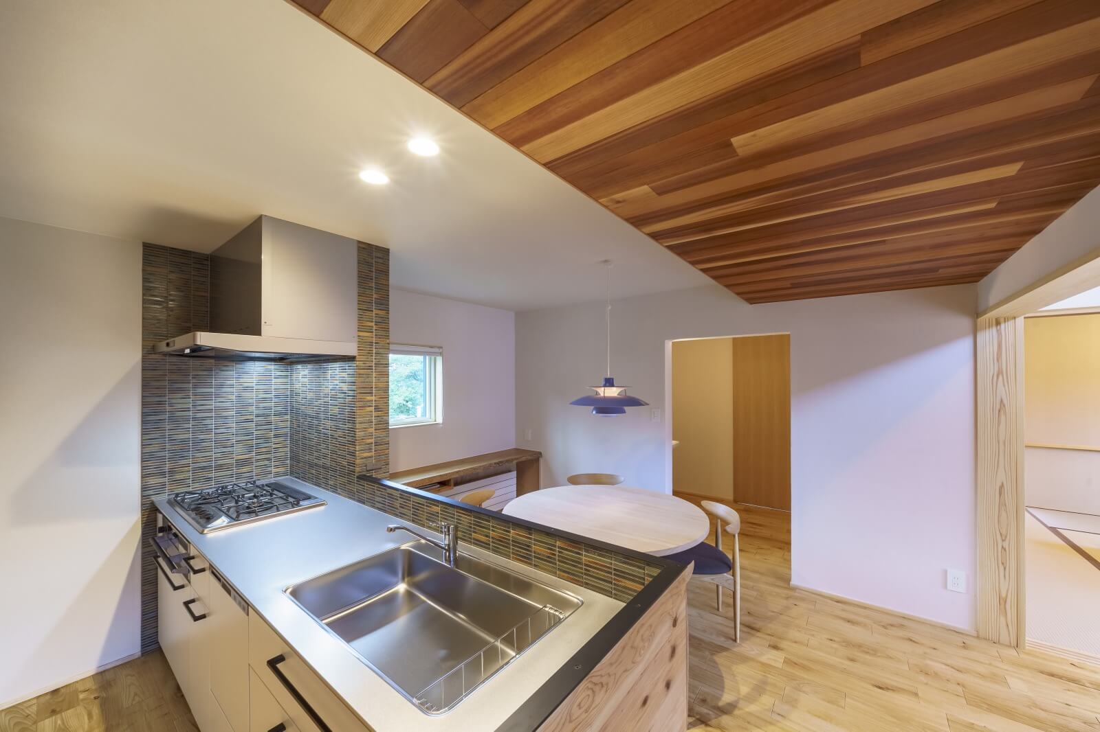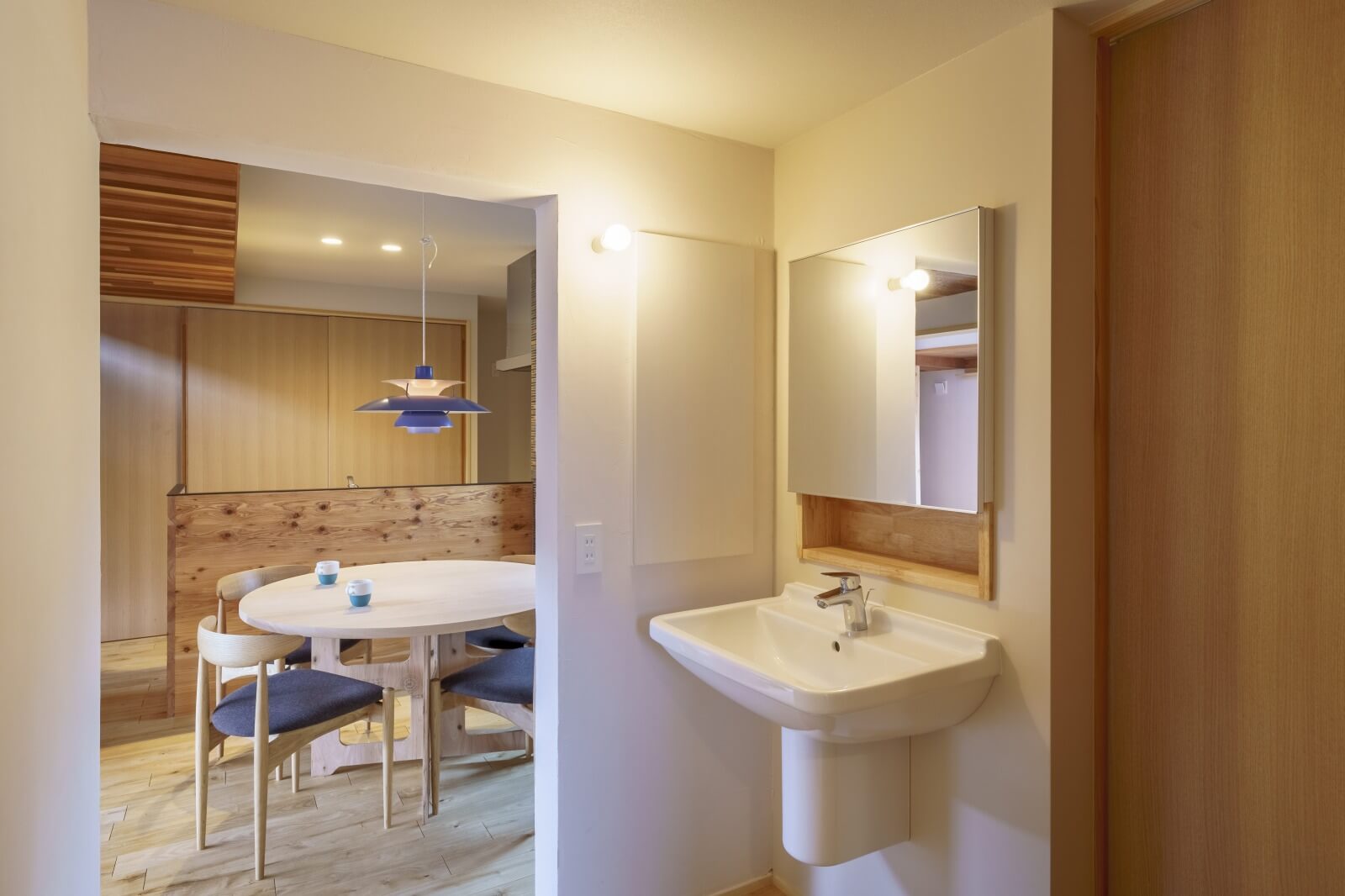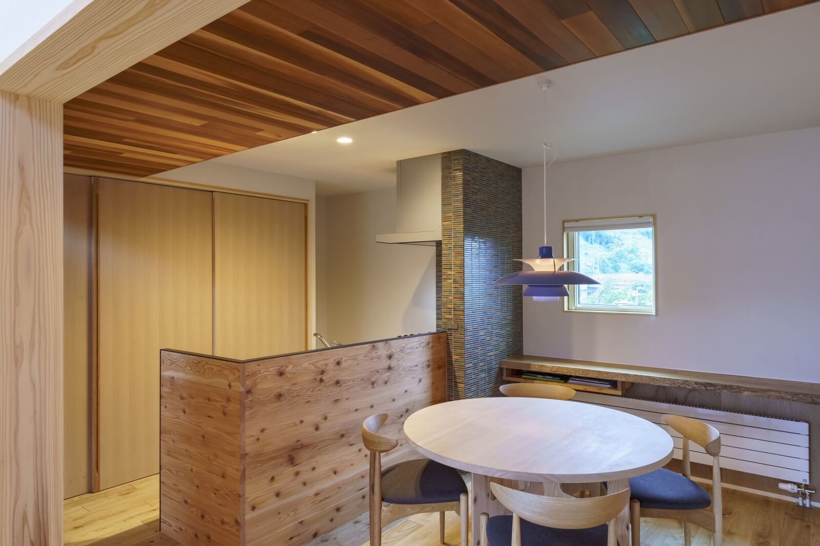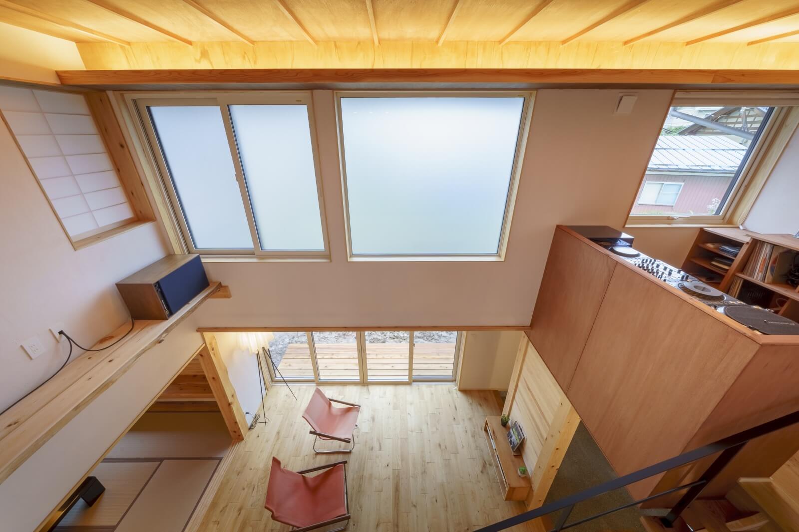 ご実家にストックしてあった木を沢山使ったバラック(いい意味で)のような家。ファサードは広い敷地にぽつんと建つ小屋のような可愛らしい外観とし、それに負けないくらいに室内も木が溢れる空間に仕上がりました。また、中二階に設けたDJブース、一見不釣り合いだけれども、使い勝手がいい和室のベンチなど、さまざまな工夫が施された住まいです。