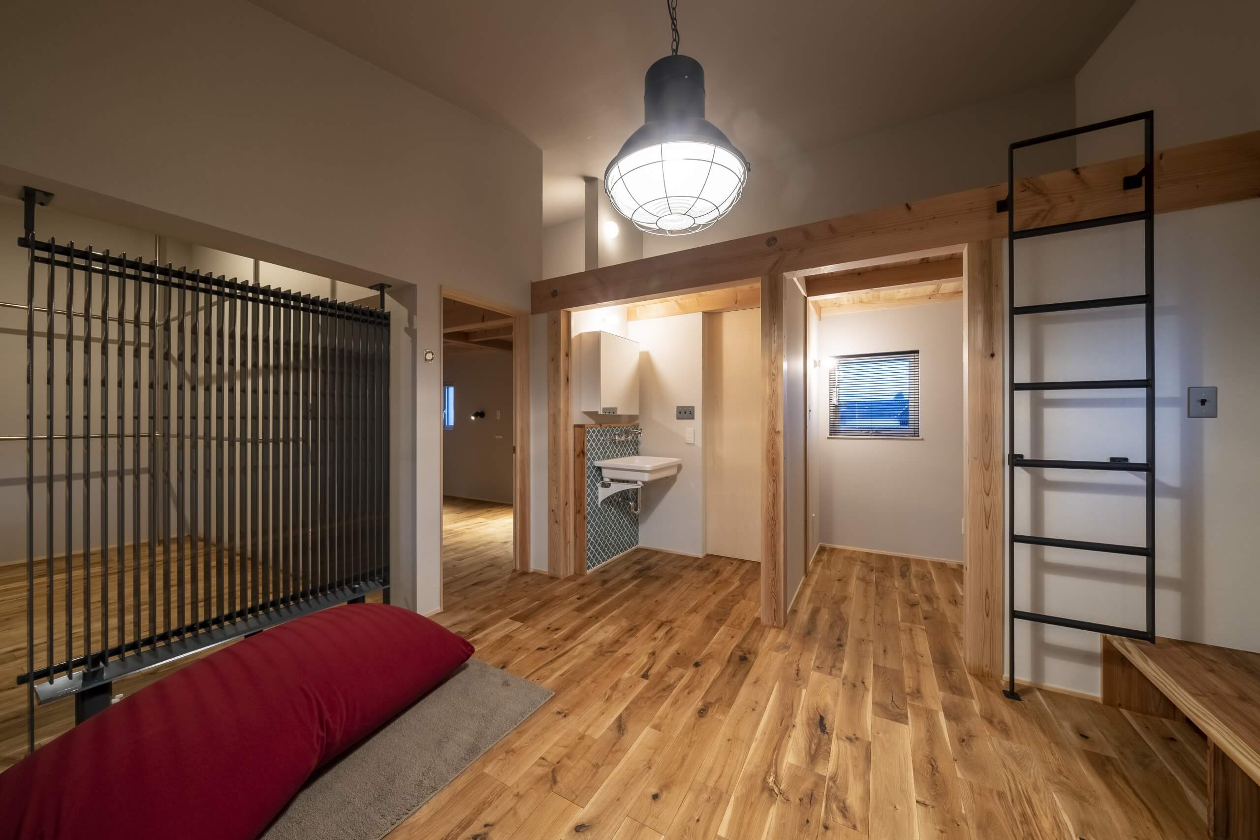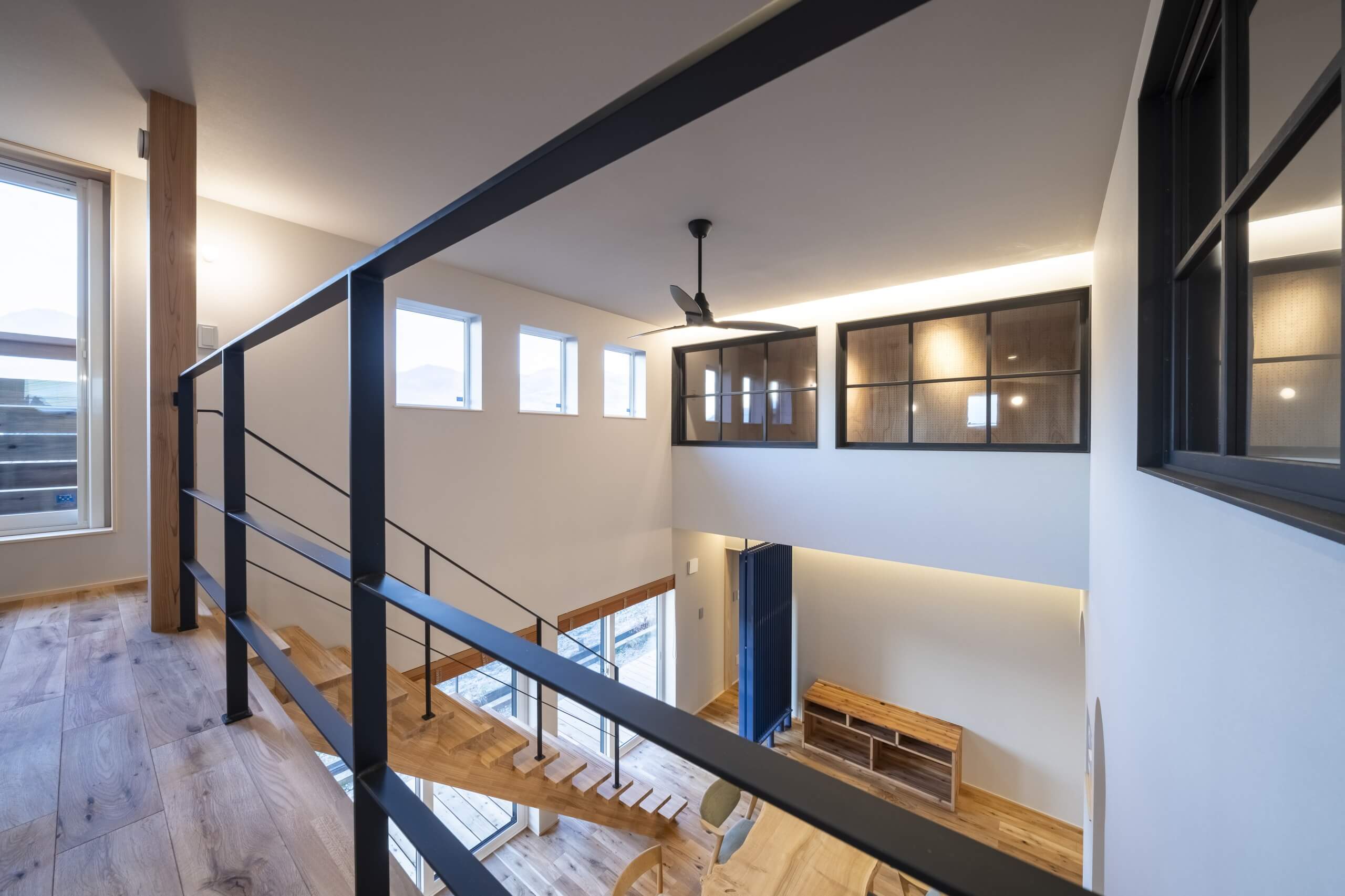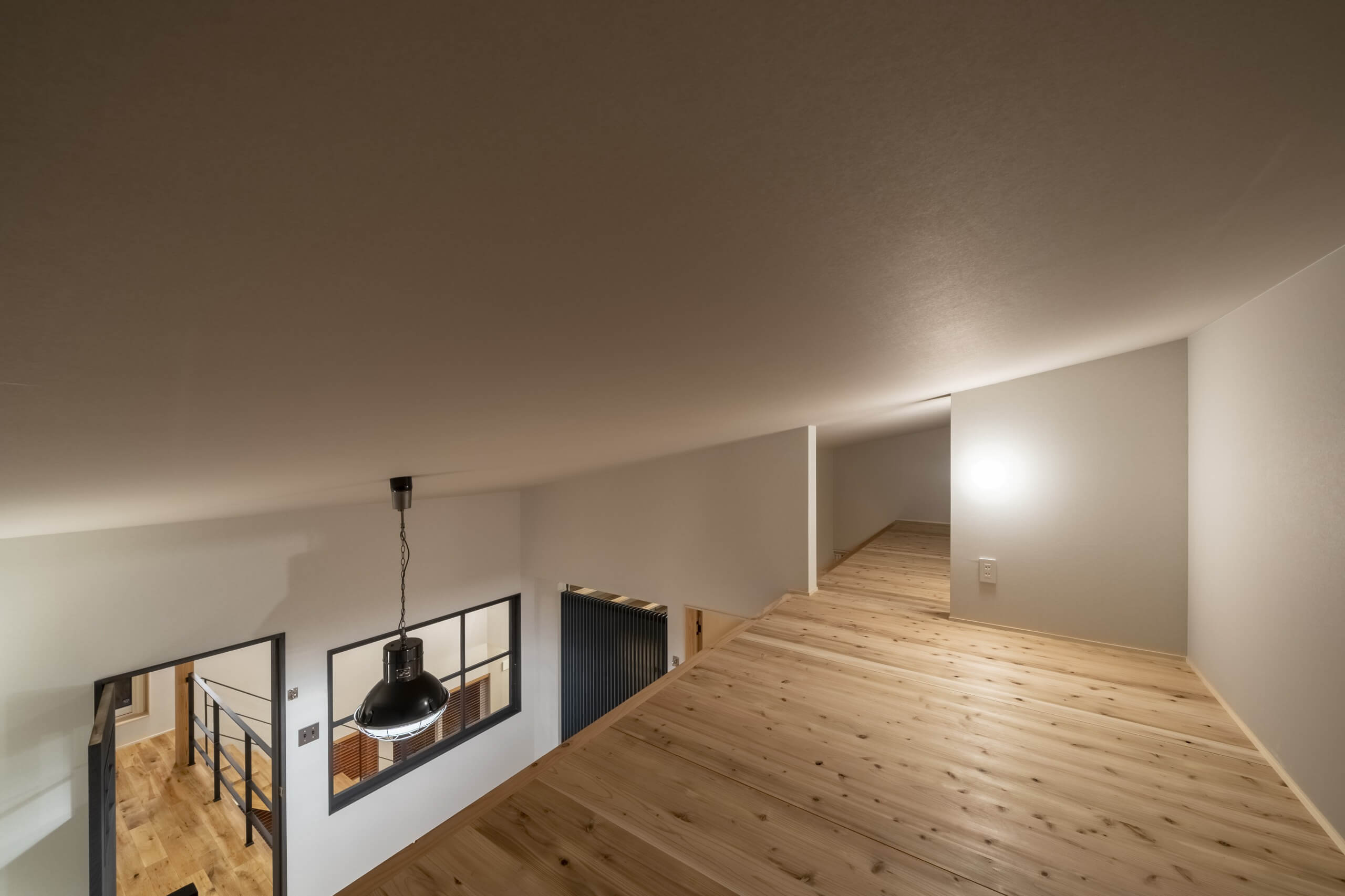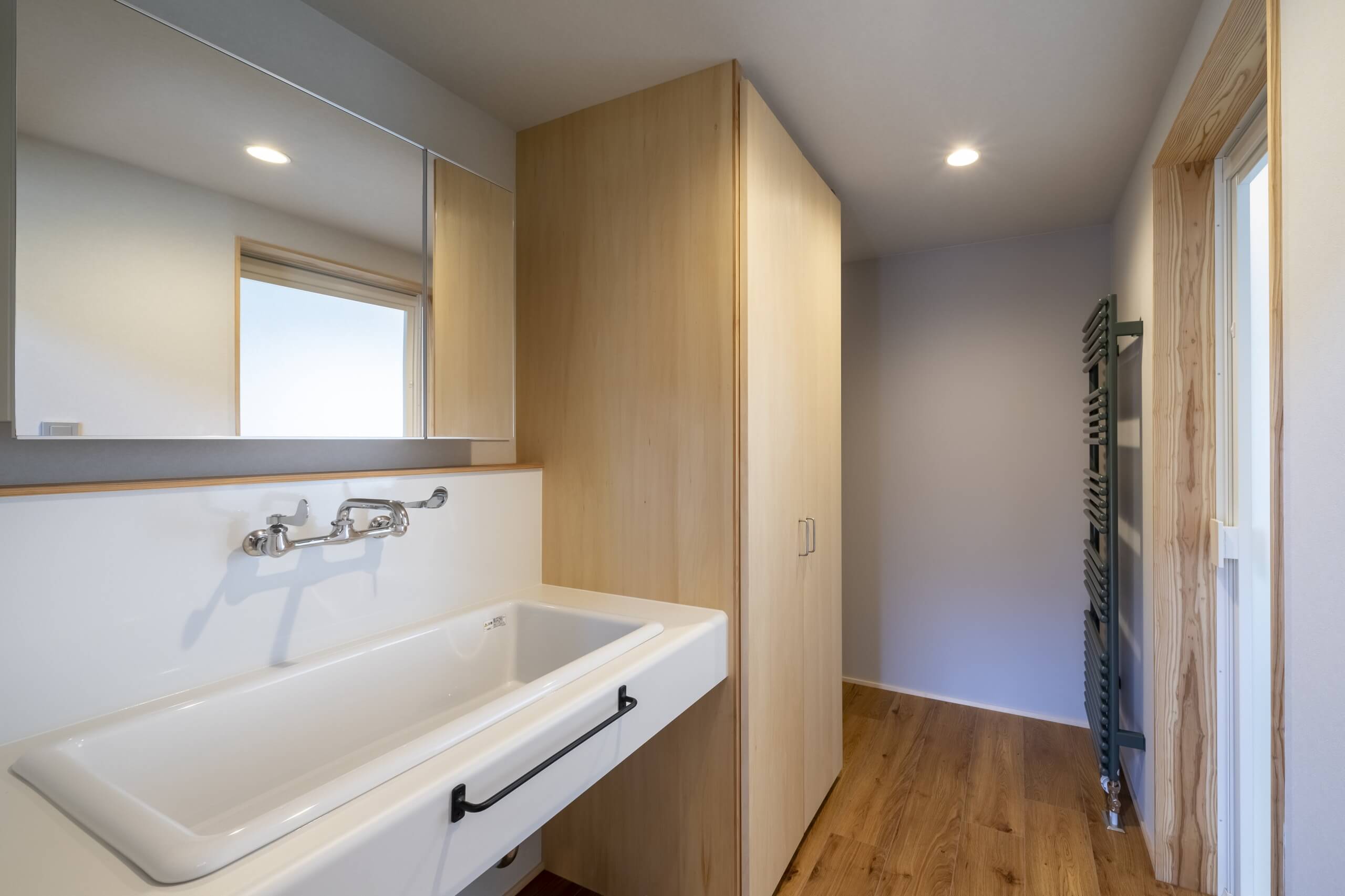 窓の外にのどかな田園風景が広がる千曲市の郊外に、コンパクトな二世帯住宅が完成。玄関、水廻りはすべて共有、そして40坪弱の広さの中にそれぞれの生活スタイルに合わせた個々の空間を実現することができました。冷暖房はPS社のパネルヒーターを採用。冬季は太陽の光も効率的に取り入れて、快適な室内環境を作り出します。