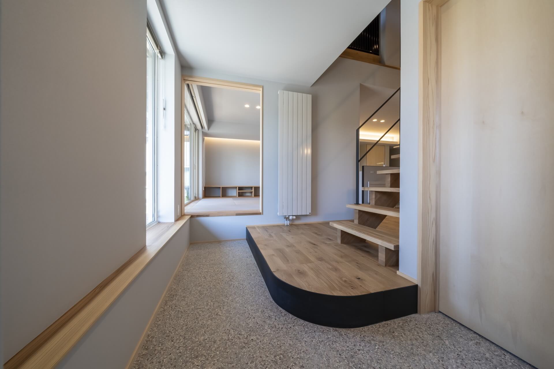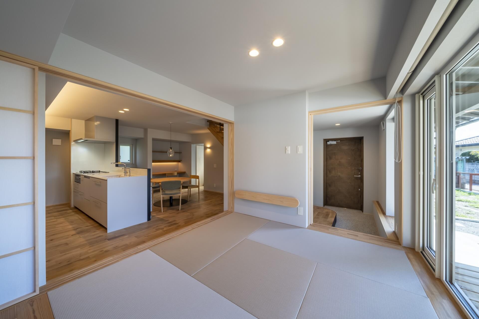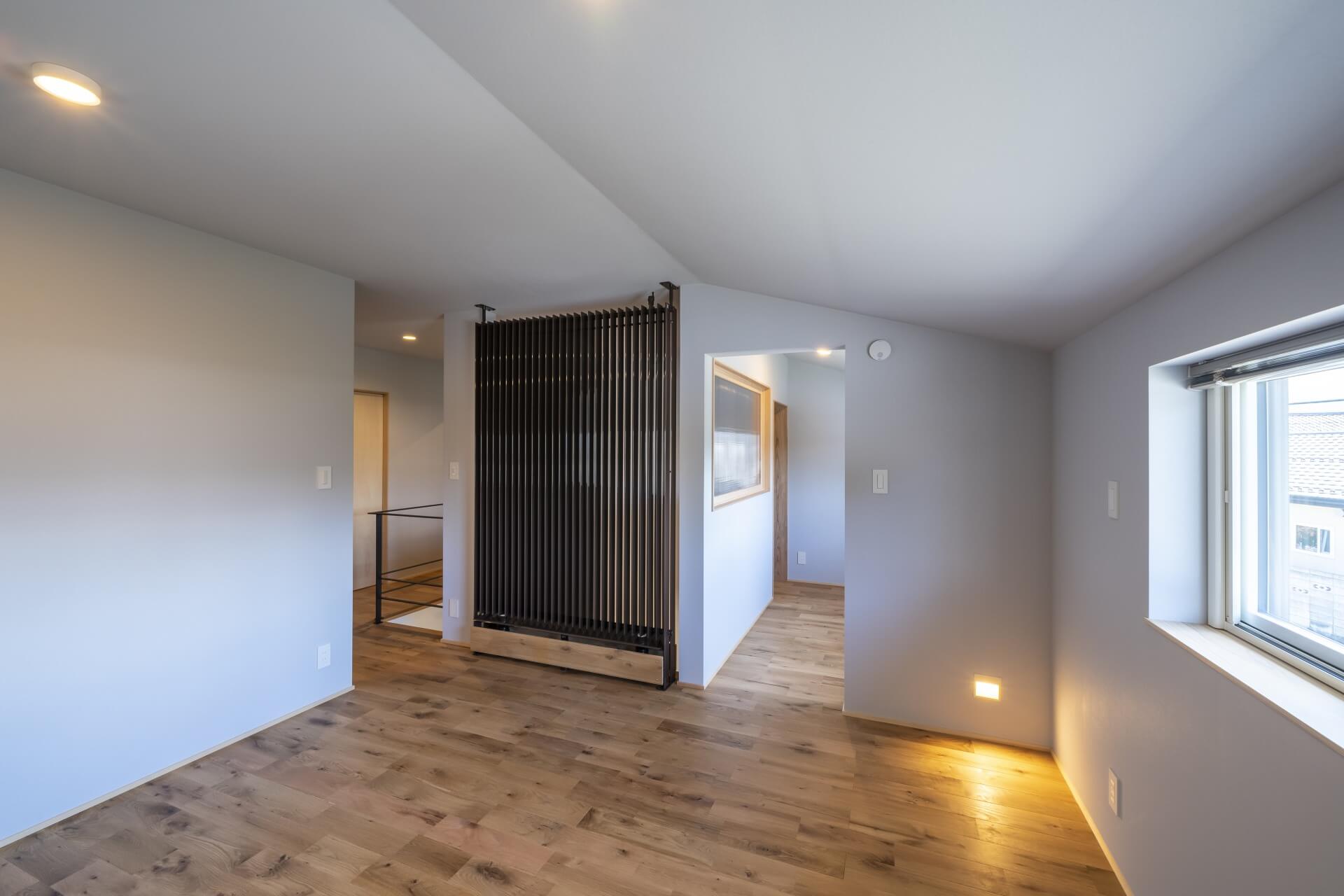 子育て真っ盛りだからこそ、たっぷりの収納や洗濯動線など、家事のしやすさにこだわった家。1階には広々リビングと障子で仕切ることができる小上がりスペースを。いっぽう浴室は2階に配し、洗濯→室内干し→収納(WIC)という動線を確保しました。また、生活リズムの異なるご夫婦のため、寝室は防音性にも配慮しました。広々した2階のフリースペースは、家族の成長とともに使いやすく変化していきます。