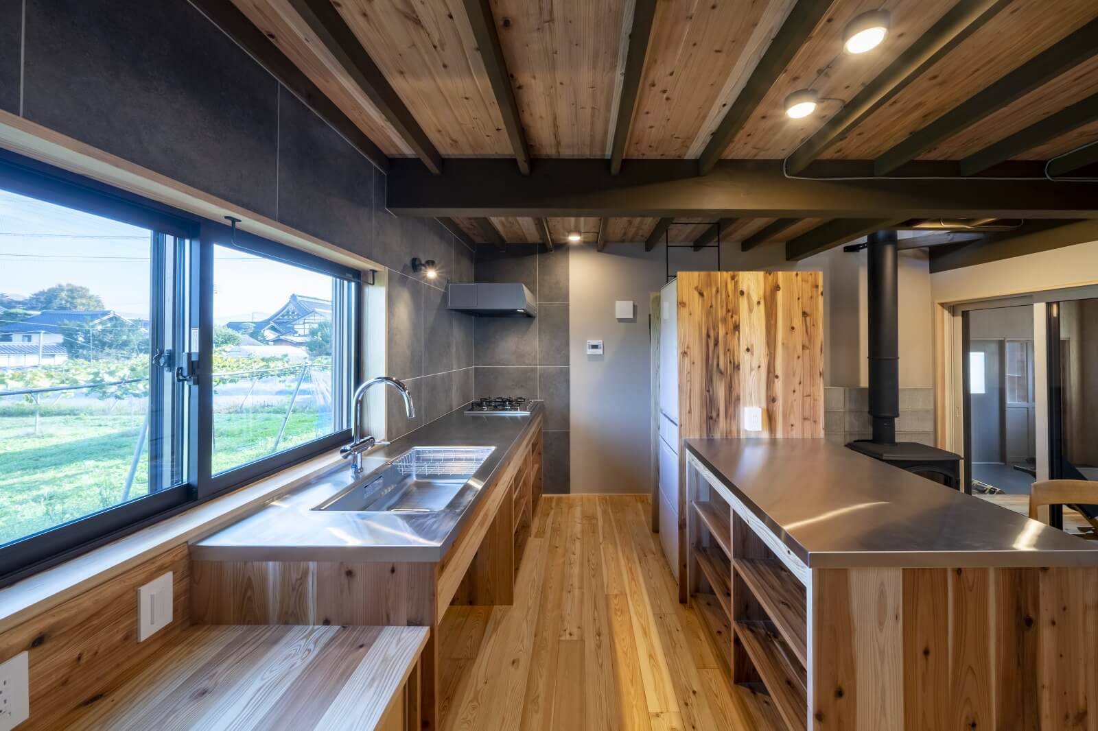 造作キッチン/ステンレス天板+杉材