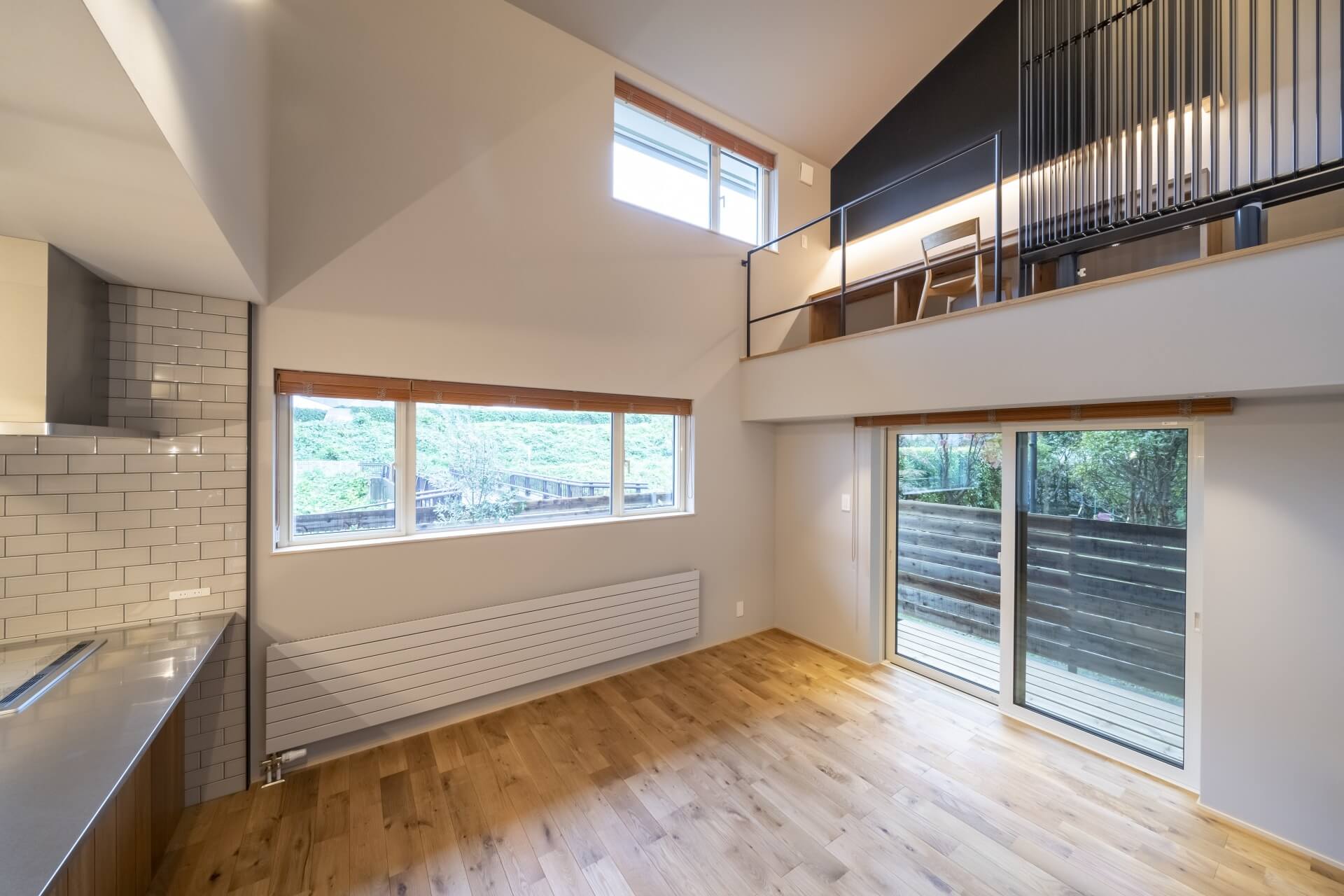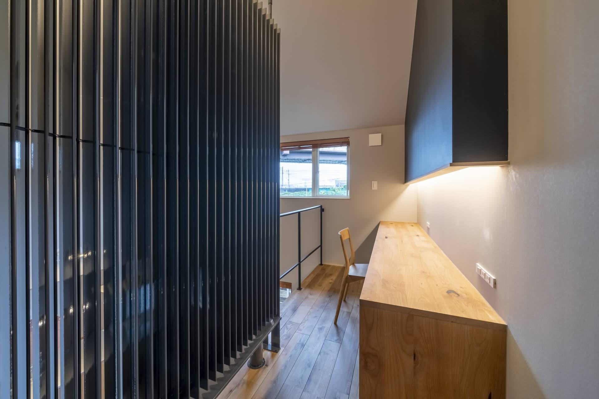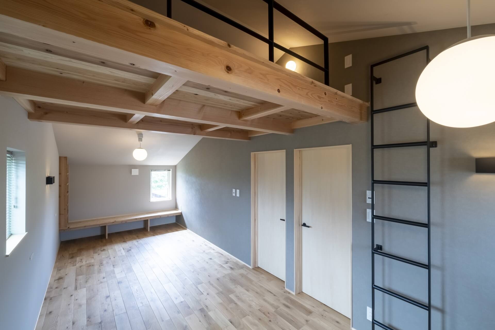 木のぬくもりがあるキッチン、帰宅 → 手洗いができる「ただいま動線」、そして壁一面にブラックボードが設置された中二階など、随所にこだわりのあるシンプル&コンパクトお家。45坪ほどの敷地でもウッドデッキや植栽も施し、季節のいい時期には外の空気も感じることができます。仲良し家族のための寝室は、ロフトとベンチのあるゆったりスペースに仕上がりました。