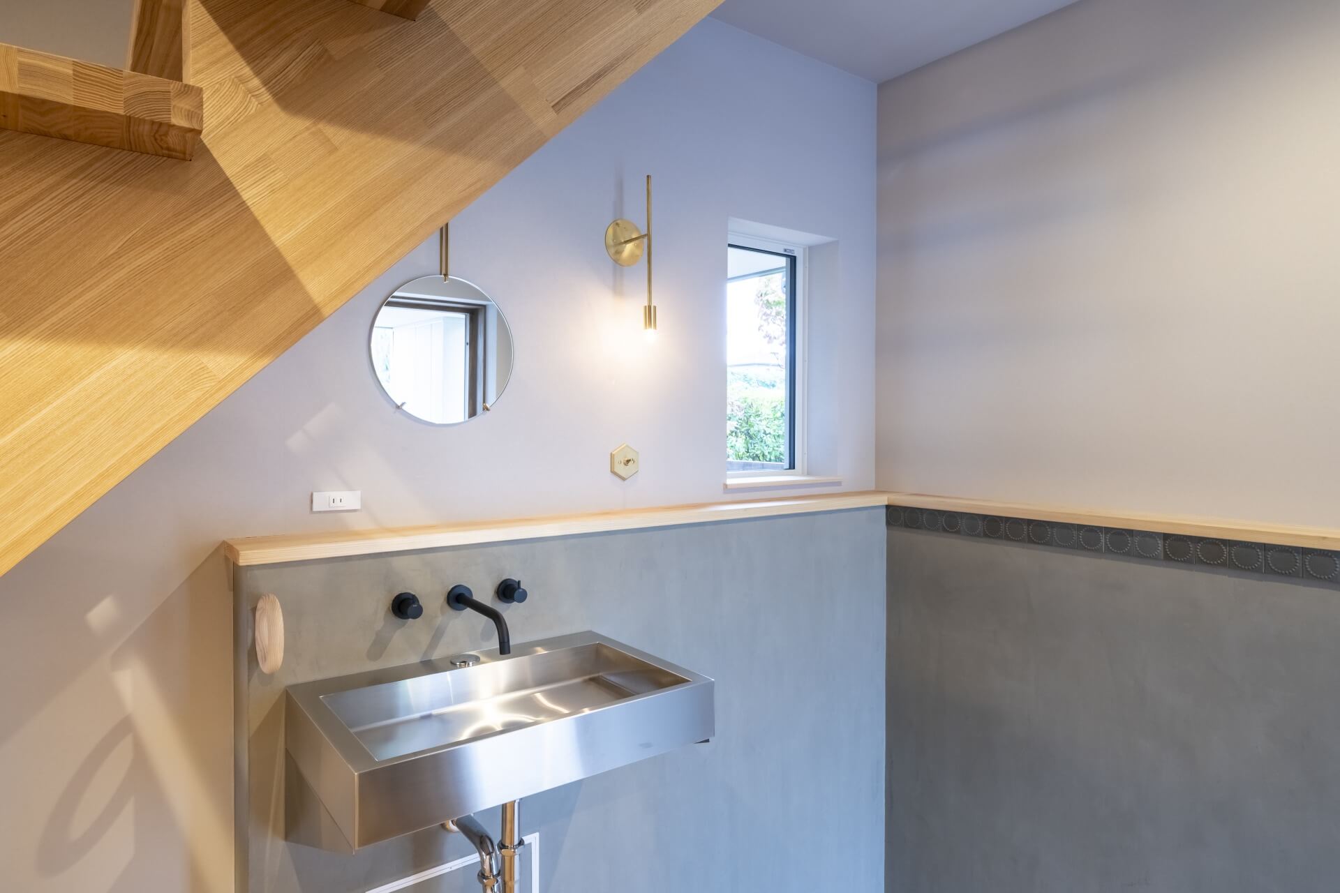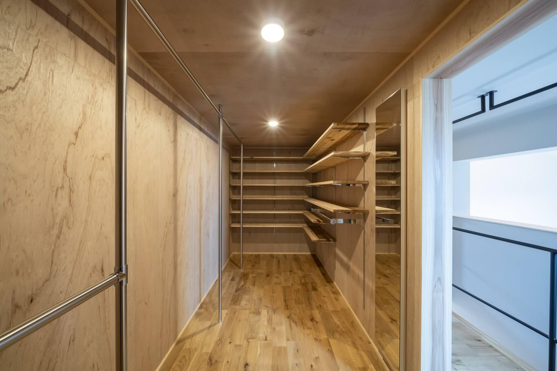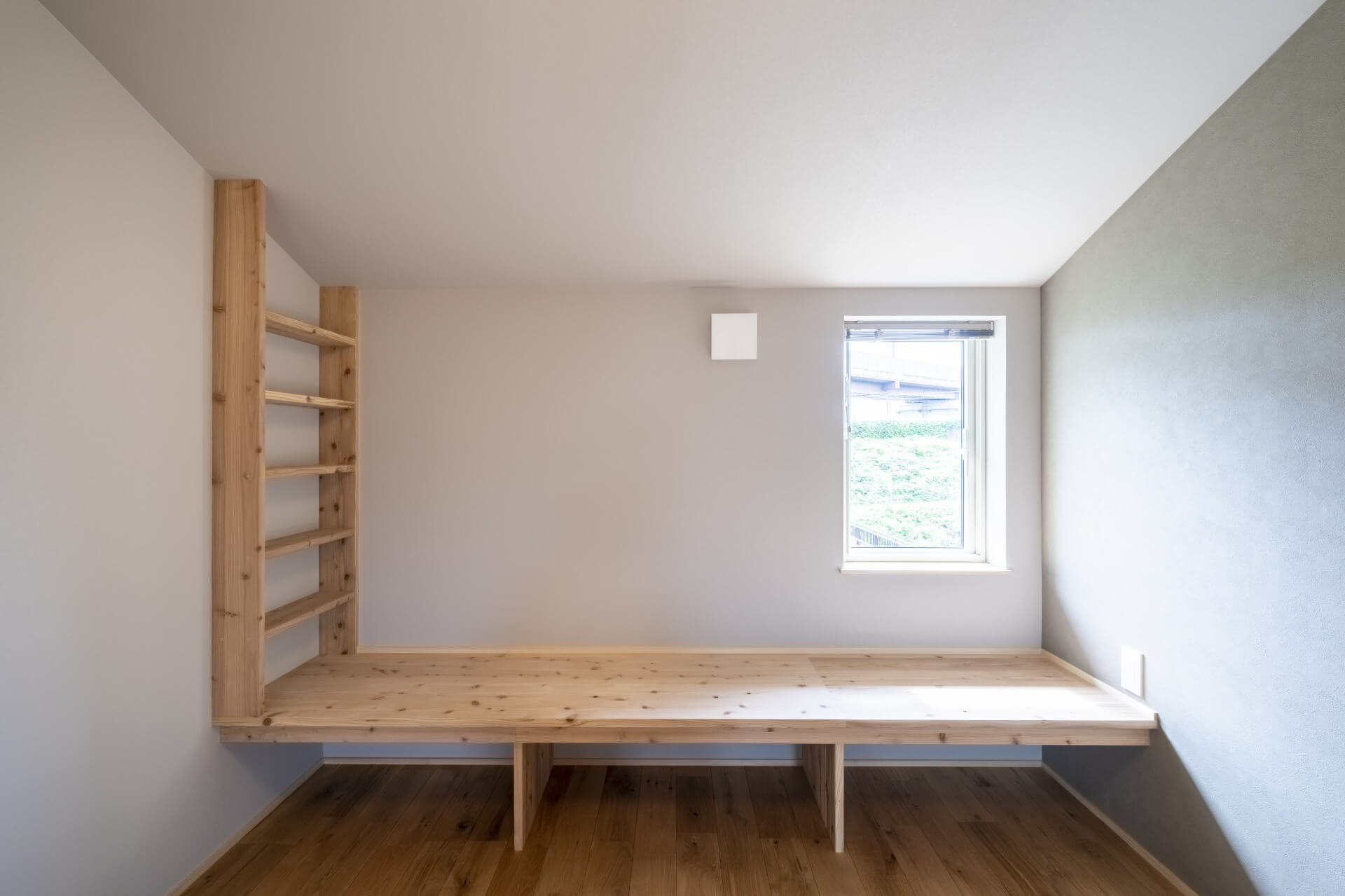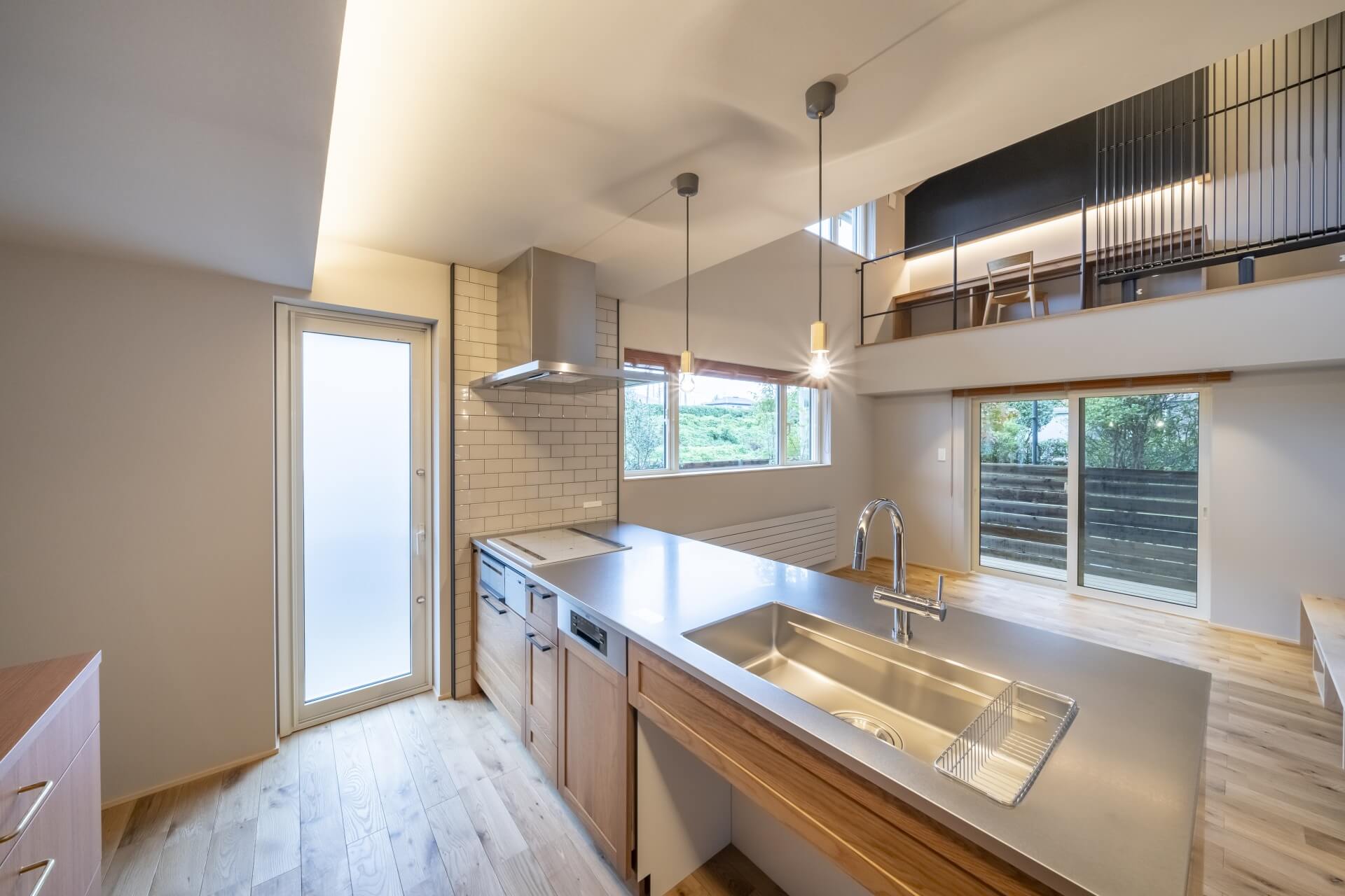 木のぬくもりがあるキッチン、帰宅 → 手洗いができる「ただいま動線」、そして壁一面にブラックボードが設置された中二階など、随所にこだわりのあるシンプル&コンパクトお家。45坪ほどの敷地でもウッドデッキや植栽も施し、季節のいい時期には外の空気も感じることができます。仲良し家族のための寝室は、ロフトとベンチのあるゆったりスペースに仕上がりました。
